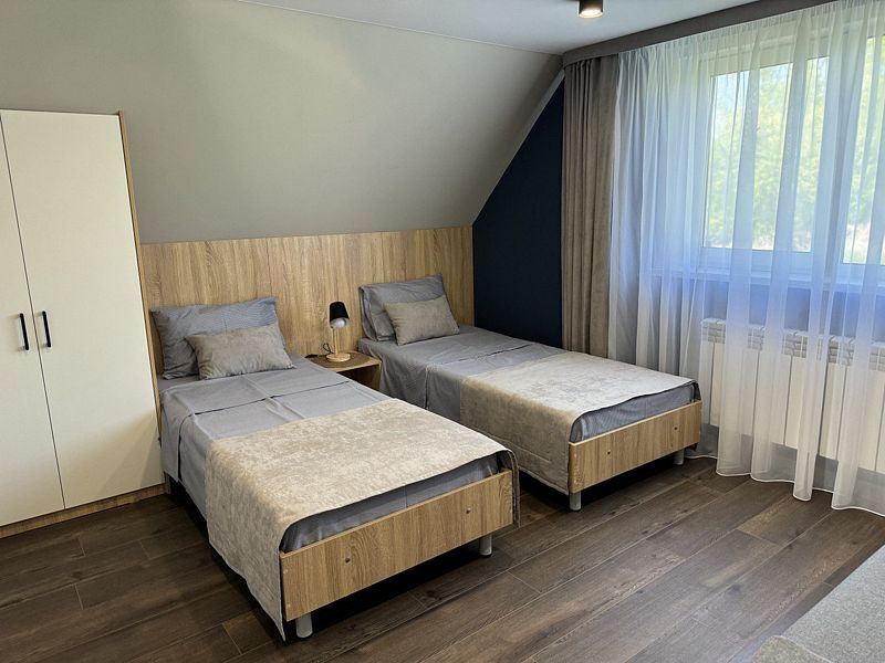 В доме: дом делится на два крыла. В правом крыле дома: 6 спален с односпальными кроватями, оборудованные шкафами и прикроватными тумбочками. На первом этаже – гостиная с раскладывающимся диваном и большим столом, кухня. с/узел и две спальни. На втором этаже 2 сануза с душем, 4 спальни с односпальными кроватями. В левом крыле - три 2-х местных и один 3-х местный номер, которые вы можете снять дополнительно.