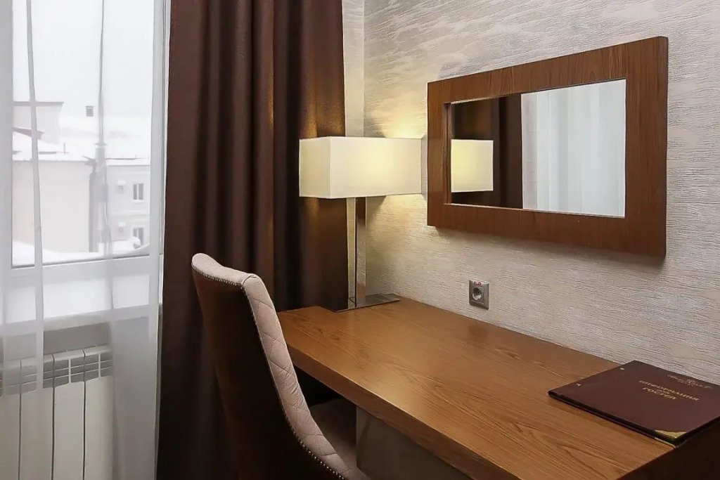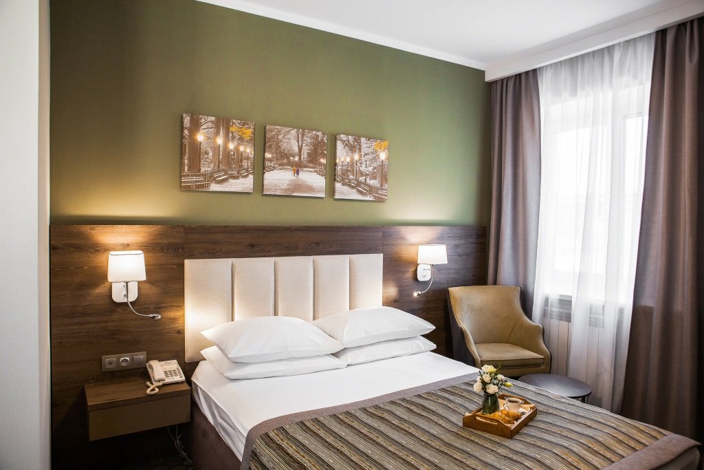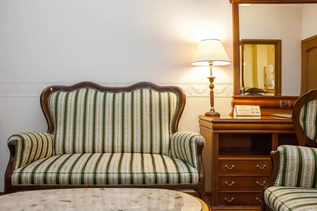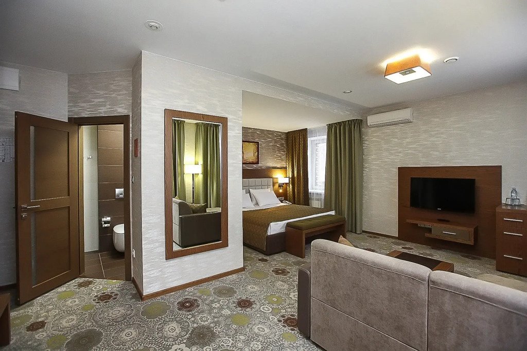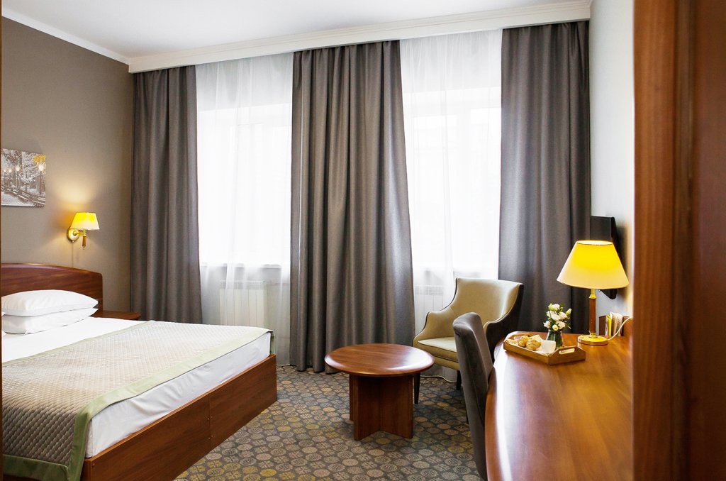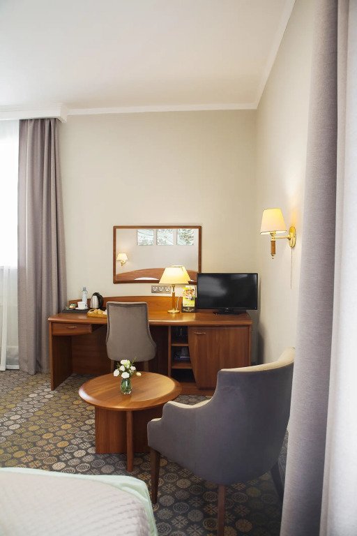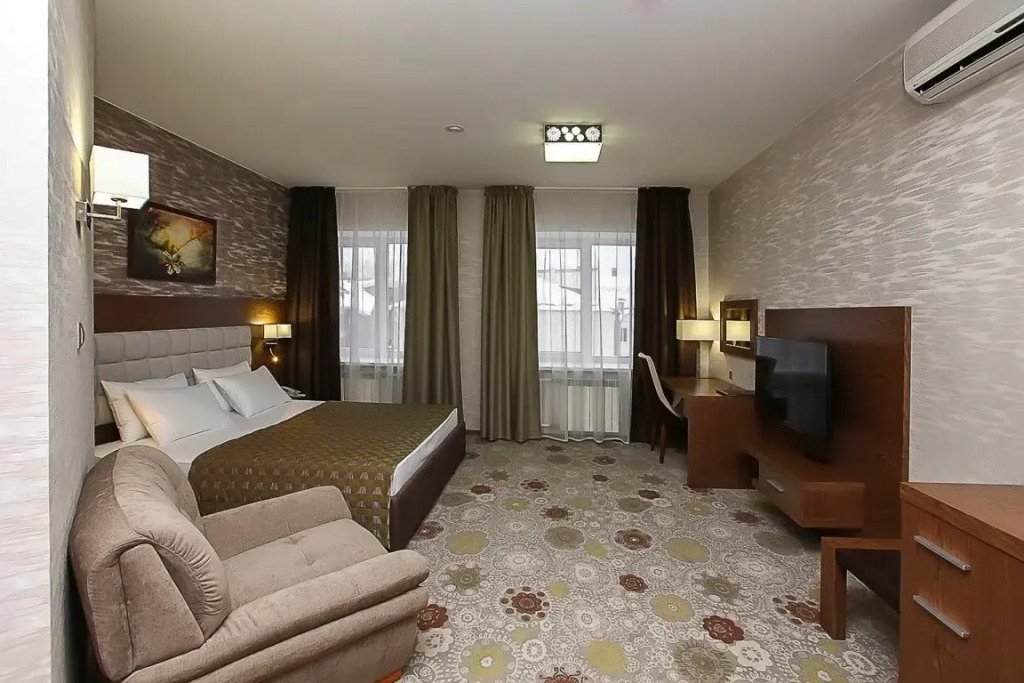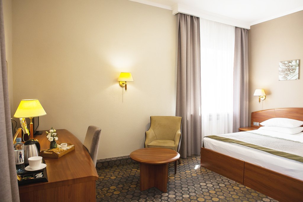 В номерах «Делюкс» и «Люкс» в числе удобств — гостиный уголок, кофемашина и гладильная система.