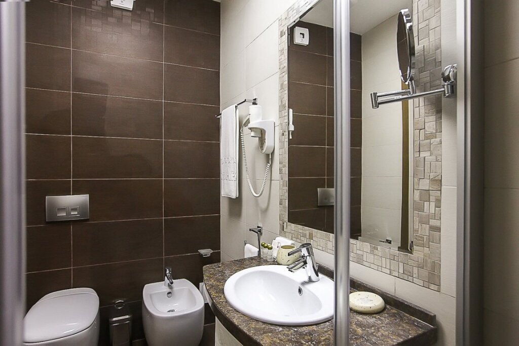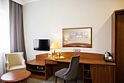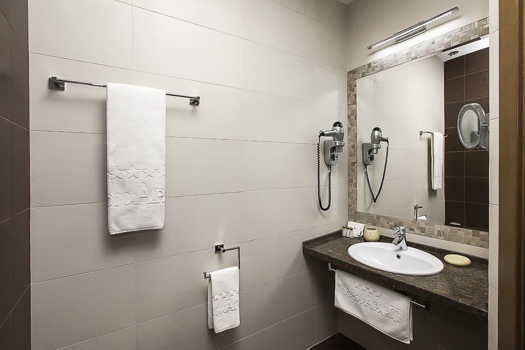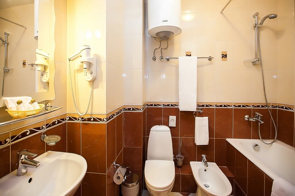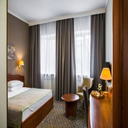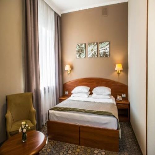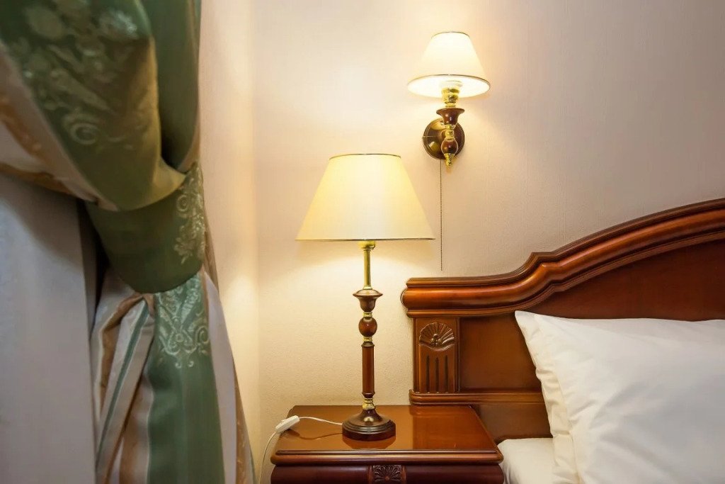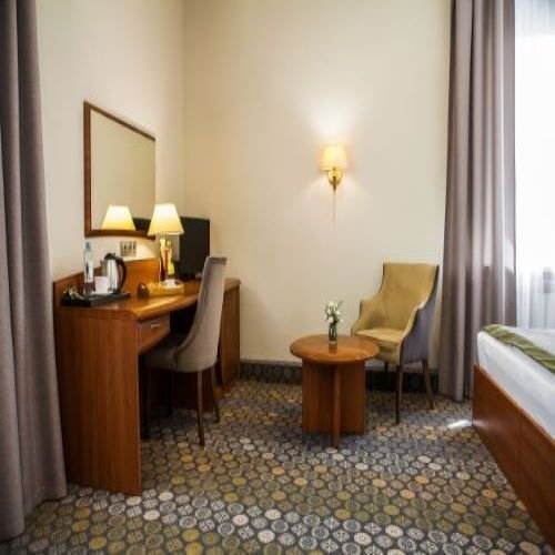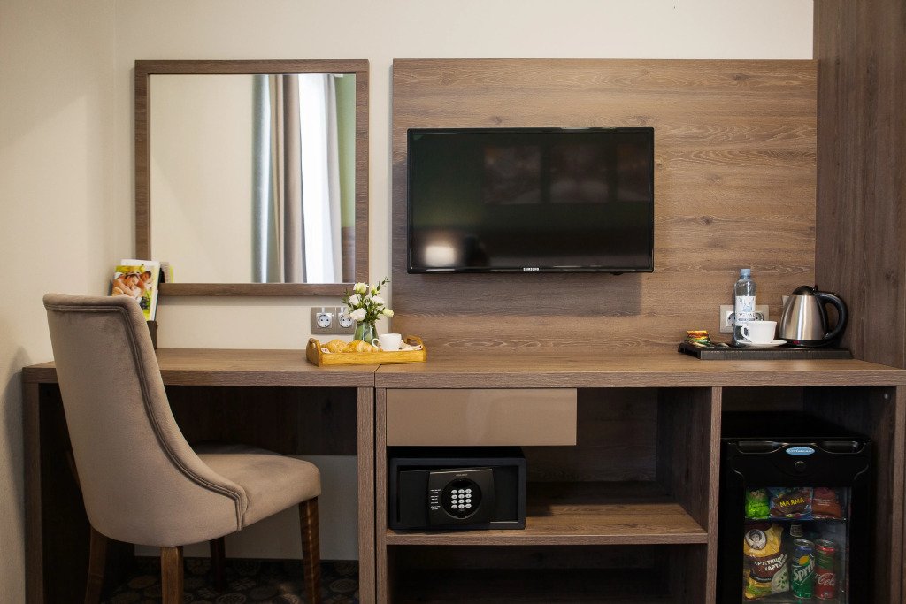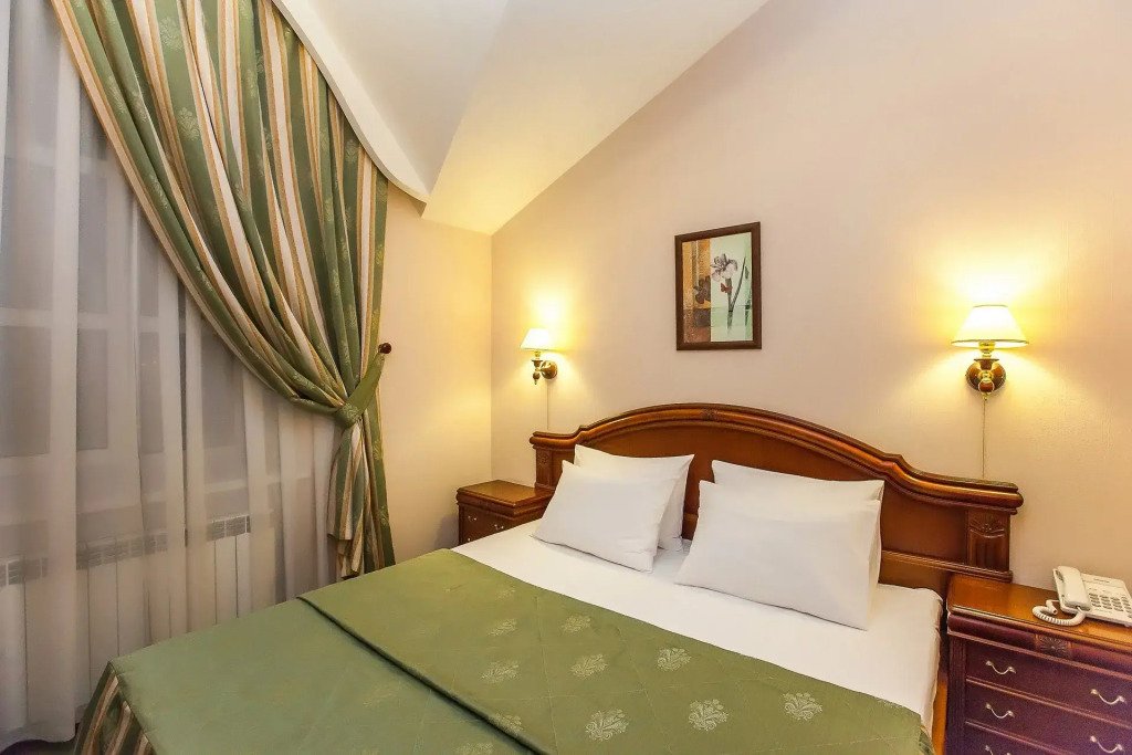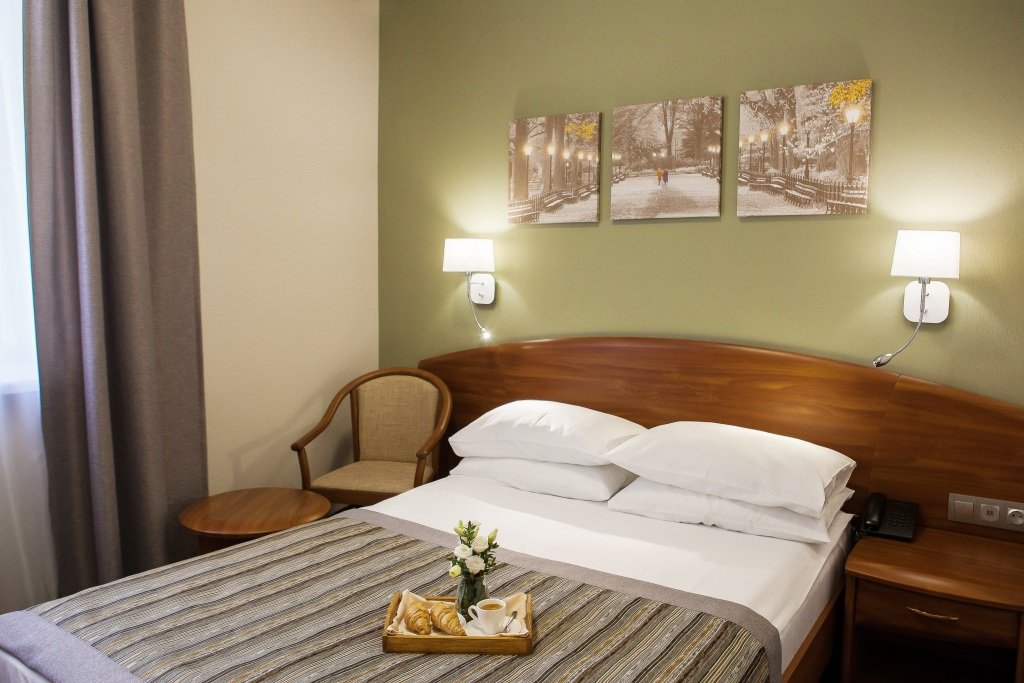 В номерах «Делюкс» и «Люкс» в числе удобств — гостиный уголок, кофемашина и гладильная система.