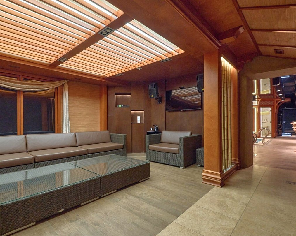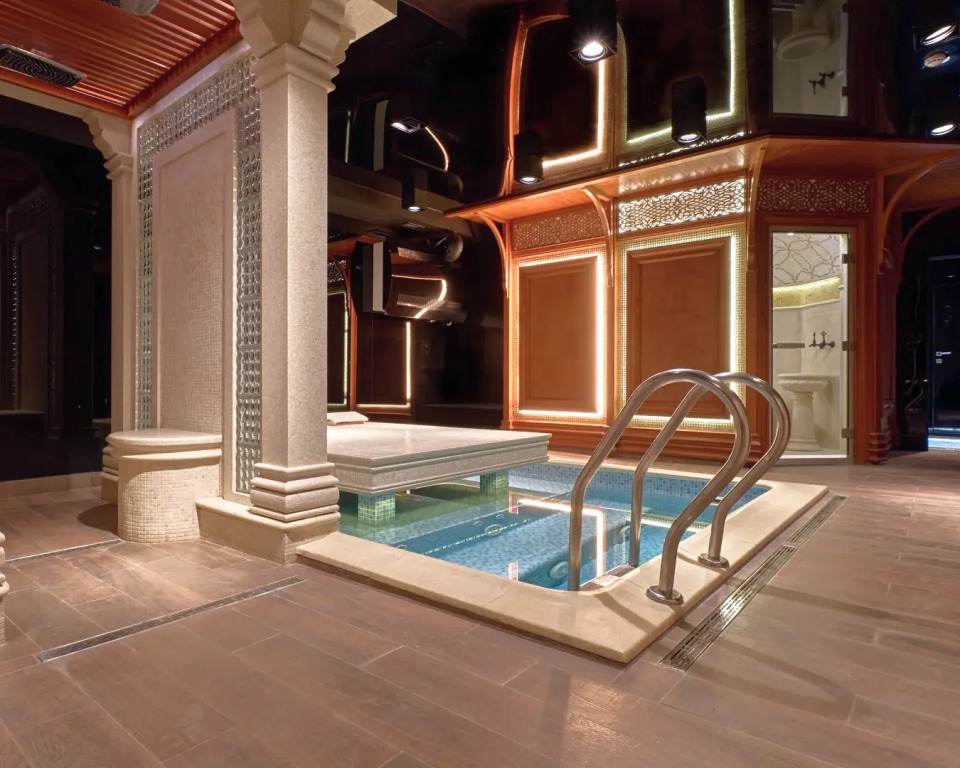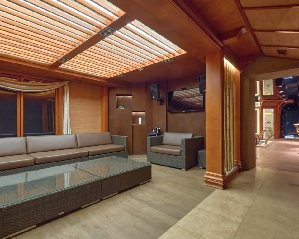 После насыщенного дня гости могут расслабиться в финской сауне с зоной отдыха, бассейном и караоке. Сауна вмещает до 8 человек — отличный вариант для компании или корпоратива.
