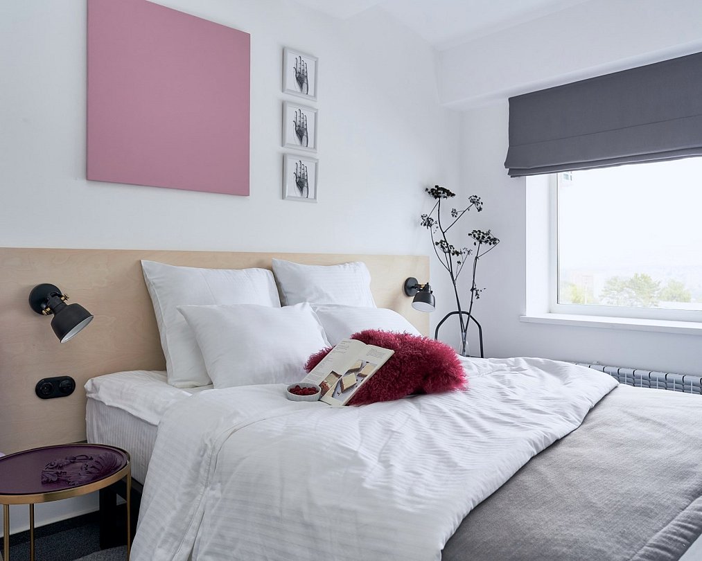 Комфортный светлый номер с большой двуспальной кроватью (доступны 4 вида дизайна: номер с микки маусом, винный номер, темно синий номер и номер с красным креслом - если у вас есть пожелания по дизайну отметьте, пожалуйста их в комментарии к бронированию) - размер кровати 180х200 см с удобной прикроватной тумбой и эргономичным освещением; - анатомический матрас и сатиновое постельное белье; - гипоаллергенные подушки и одеяло; - ЖК телевизор с функцией SMART; - бесплатный высокоскоростной WI-FI; - легкодоступные точки для зарядки электронных устройств; - сейф; - кондиционер; - чайная станция с питьевой водой и набором посуды; - холодильник; - прихожая с большим зеркалом. По запросу в номер можно поставить дополнительное спальное место по стоимости 700 руб/сутки, но нужно минимум за 24 часа до заезда предупредить администратора по номеру телефона +79808004961Услуги и удобства