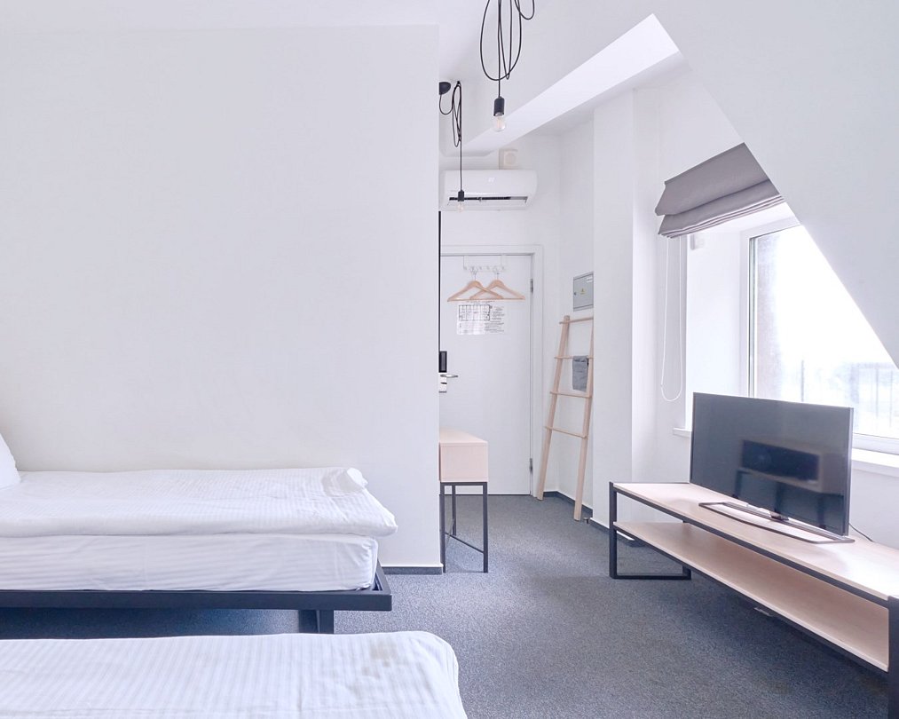 Wi-Fi, кондиционер, фен, электронные замки, водонагреватель, гигиенические средства, две односпальные кровати, тумбы, вешалки, багажная тумба, зеркало, унитаз, раковина, душ, вид во двор, телевизор с плоским экраном, без питомцевВ гостиничном номере