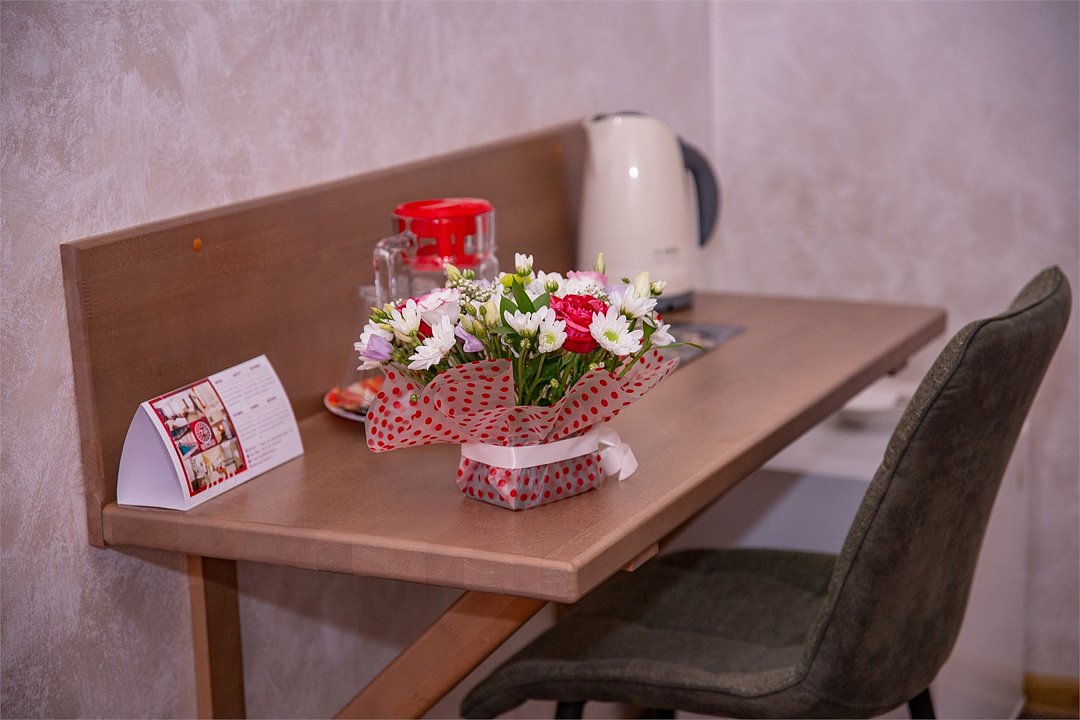 Современные, удобные номера площадью от 25 до 32 м². Оснащены всем необходимым для Вашего комфортного пребывания. Студия дополнительно оснащена кухней. К услугам гостей полный набор одноразовых принадлежностей: халат, тапочки, отельная косметикаУслуги и удобства