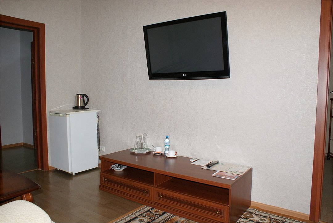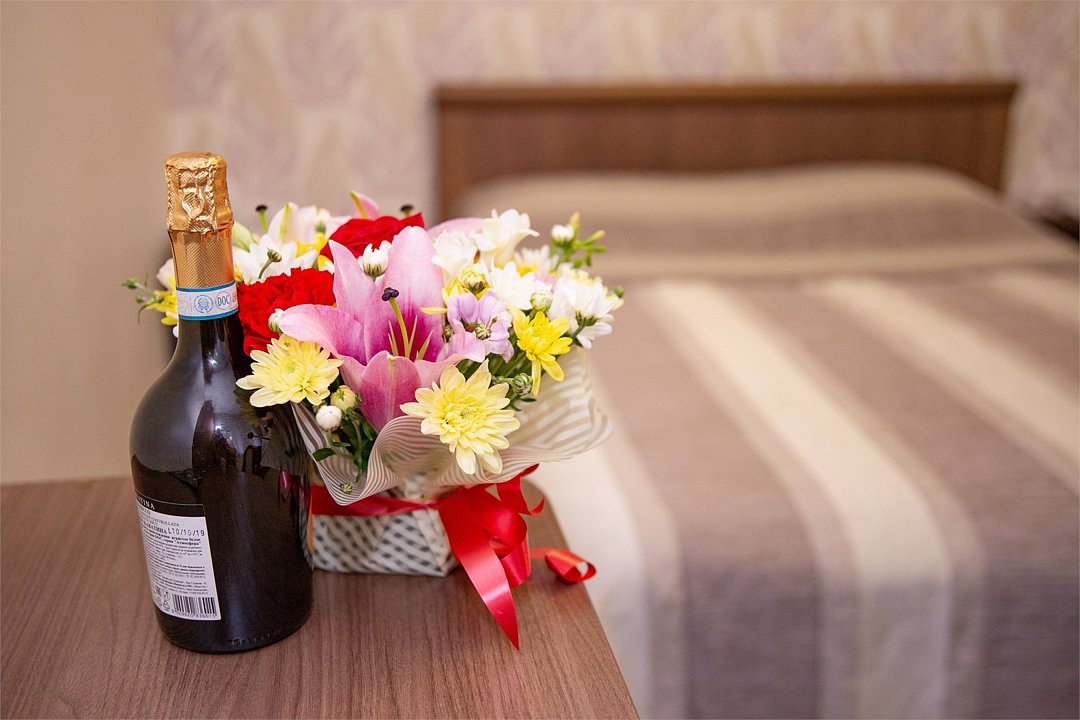 Просторный двухкомнатный номер площадью 43-46 м², состоит из спальни и гостиной. Оснащен всем необходимым для Вашего комфортного пребывания. К услугам гостей полный набор одноразовых принадлежностей: халат, тапочки, отельная косметикаУслуги и удобства