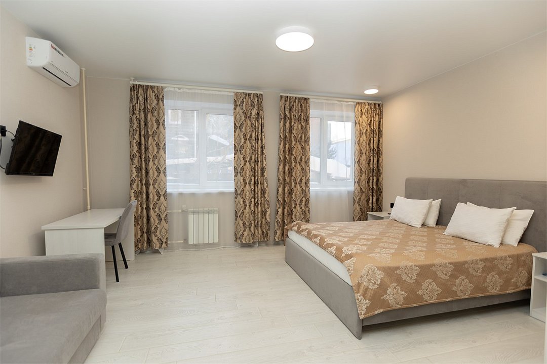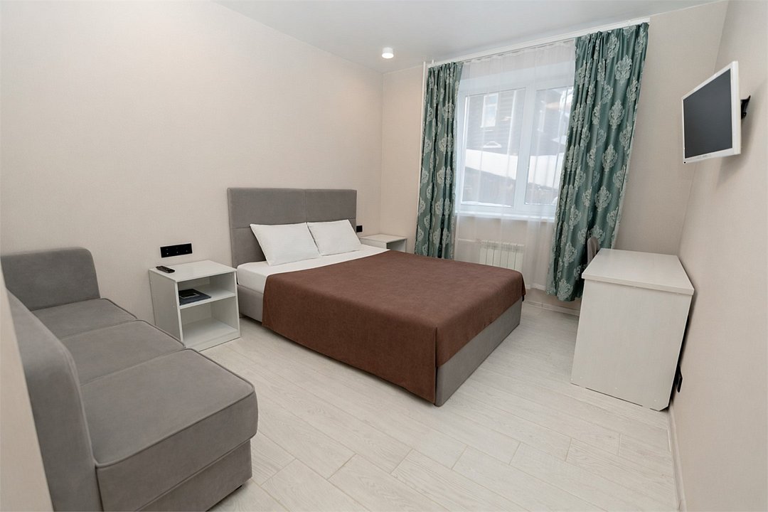 Wi-Fi, холодильник, кондиционер, фен, обогреватель, ванна, халаты, тапочки, гигиенические средства, две двуспальные кровати, диван, гардеробная, вешалки, письменный стол, зеркало, набор посуды, обслуживание номеров, информационная карта, меню, чайник, унитаз, вид на город, кулер на этаже, стаканы, столовые приборы, стул, туалетные средства, цифровое тв, диван-кровать, раскладной диван, телевизор с плоским экраном, москитная сетка, можно с питомцамиВ гостиничном номере