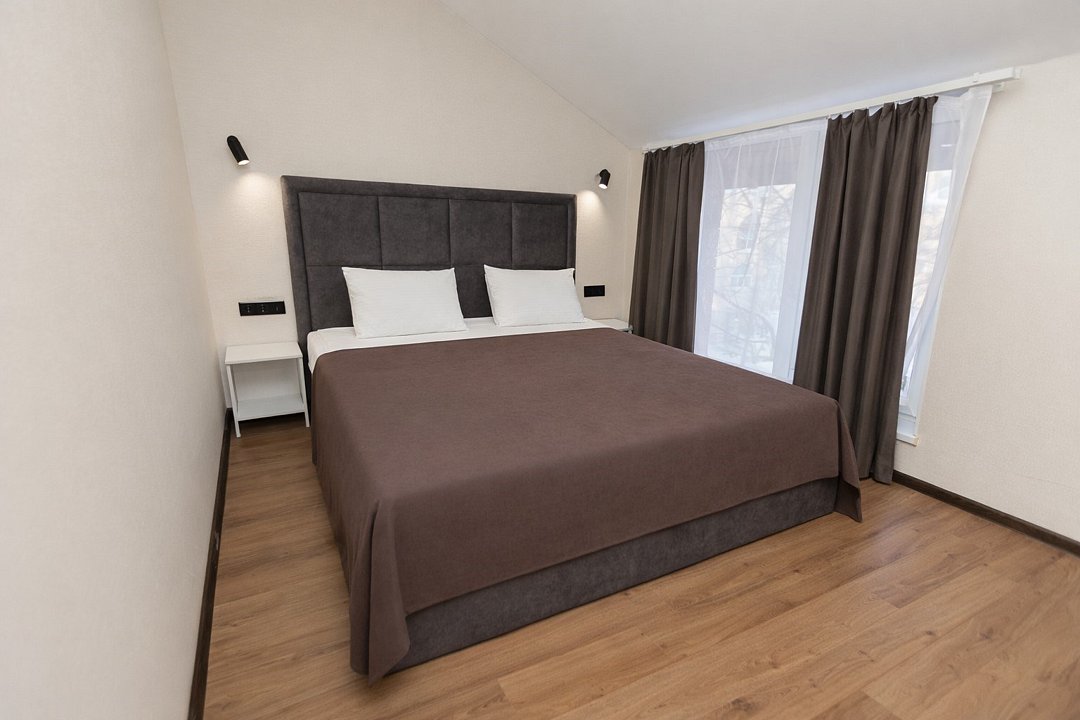 Просторные номера площадью до 35 кв.м., позволяющие разместиться компании из 4-х человек. Отличаются повышенной комфортностью спального места, зонированием места отдыха и сна, большой площадью ванной комнаты. Вас порадует сочетание изысканного интерьера и дорогих, качественных материалов. Идеальный вариант для работы, отдыха и приема гостей.Услуги и удобства
