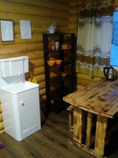 2 двухъярусные кровати или полати (на выбор), стол, телевизор, чайник, холодильник, большая веранда, зона для пикника с мангалом, WI-FI. Удобства на улице.