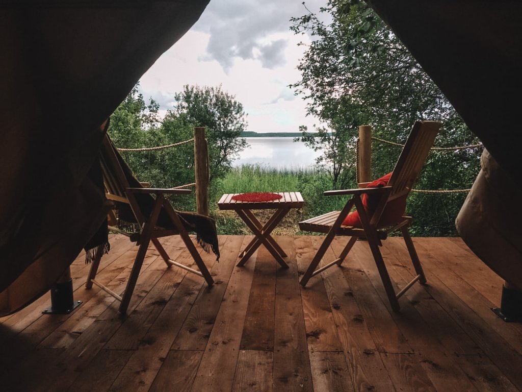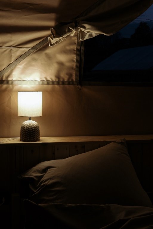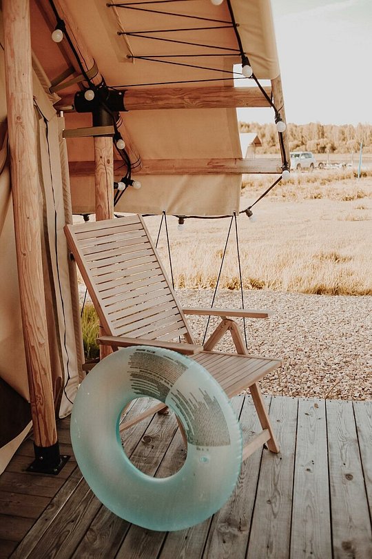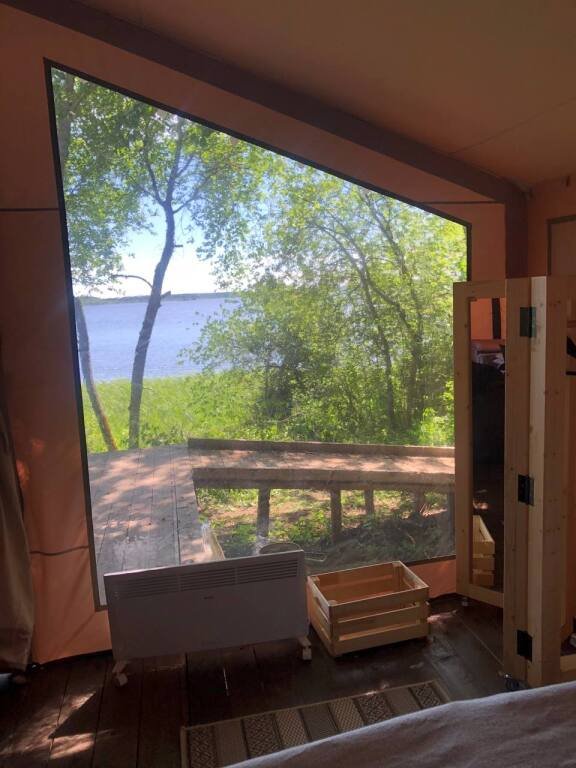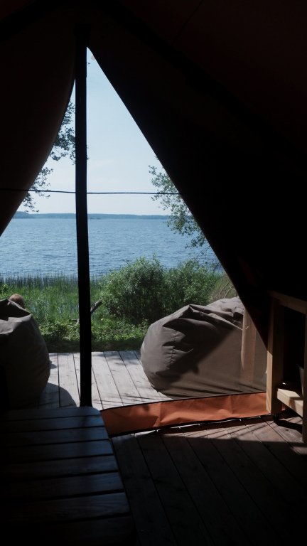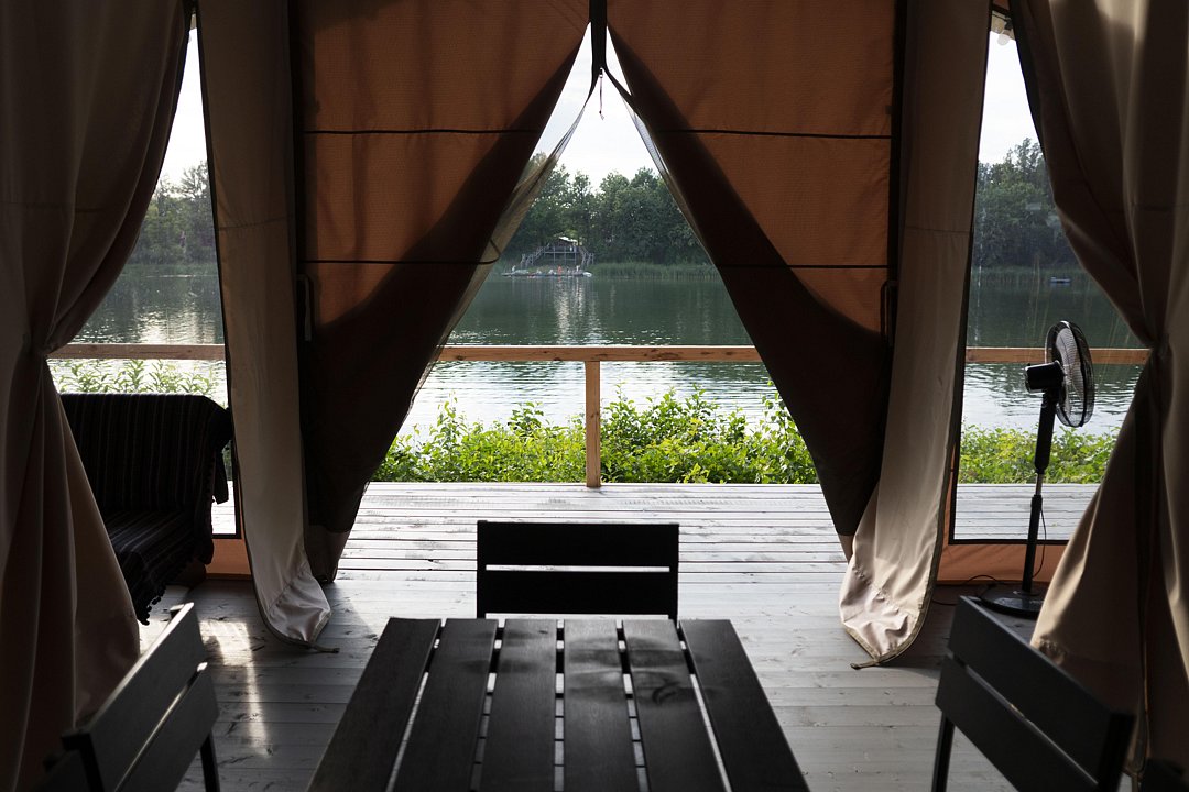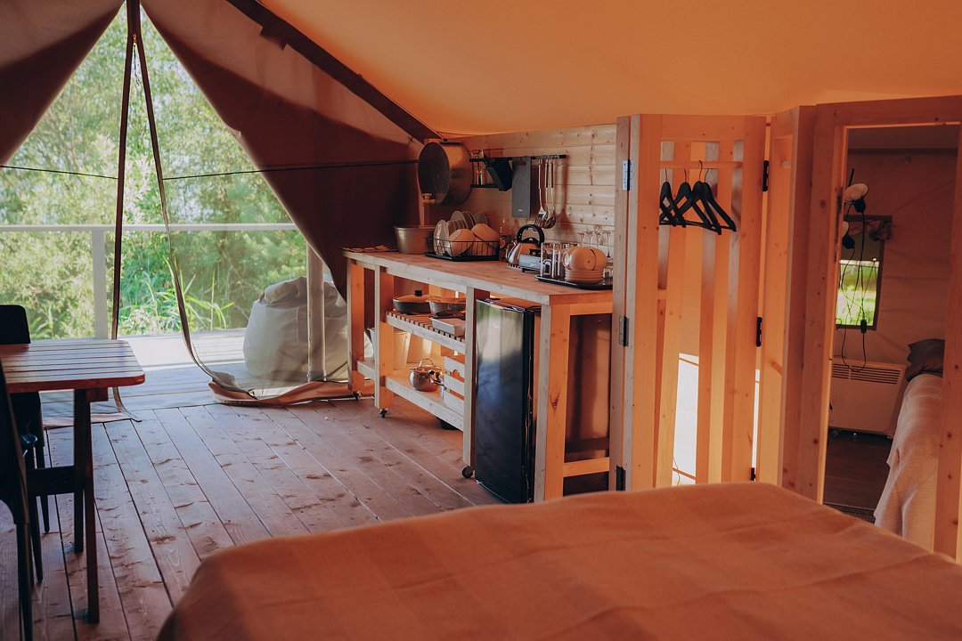 Сафари-тент вместимостью до 3 человек с видом на озеро. В распоряжении гостей: двуспальная кровать, раскладное кресло, мини-кухня, санузел и душевая на территории.