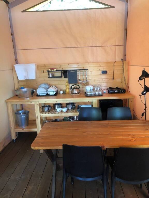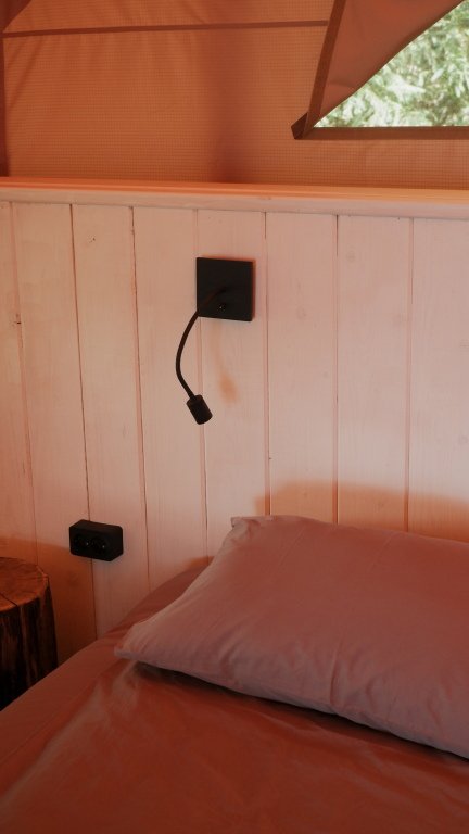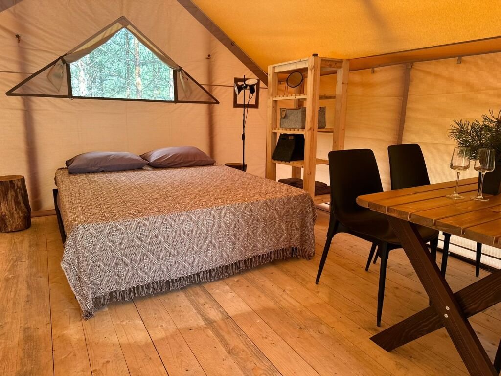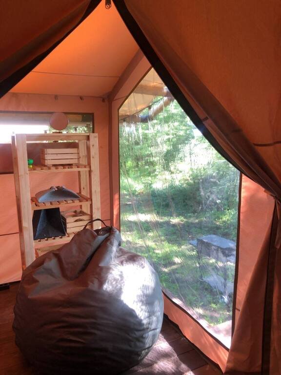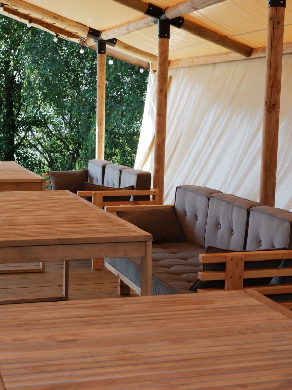 Улучшенный сафари-тент вместимостью до 5 человек. В распоряжении гостей: двуспальная кровать, раскладное кресло и диван, мини-кухня. Душевая и санузел на территории.