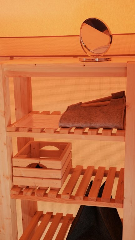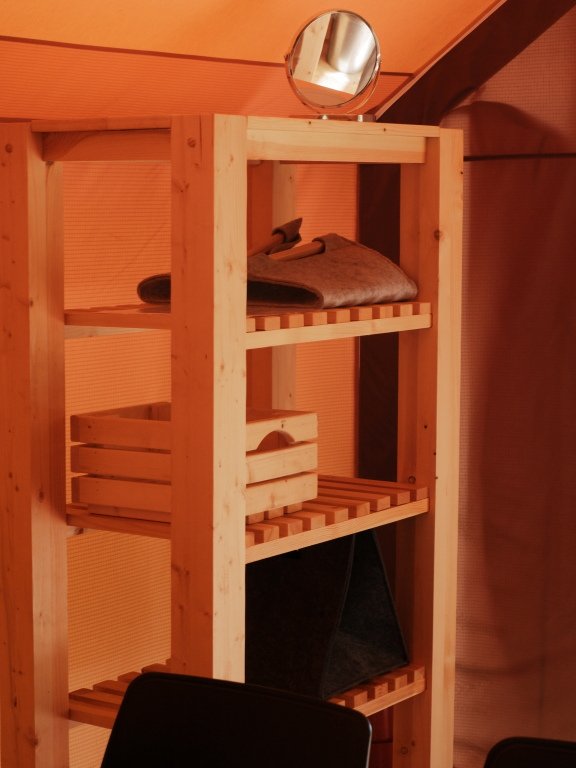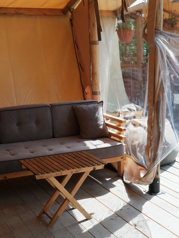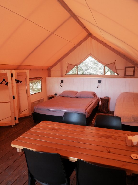 В сафари-тенте одна двухспальная кровать, одна односпальная кровать. В качестве дополнительного спального места - диван кровать у стола.