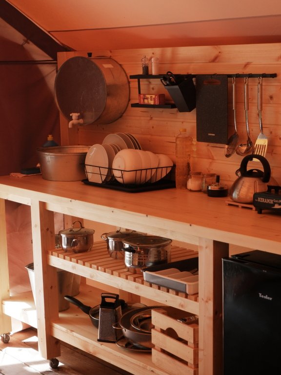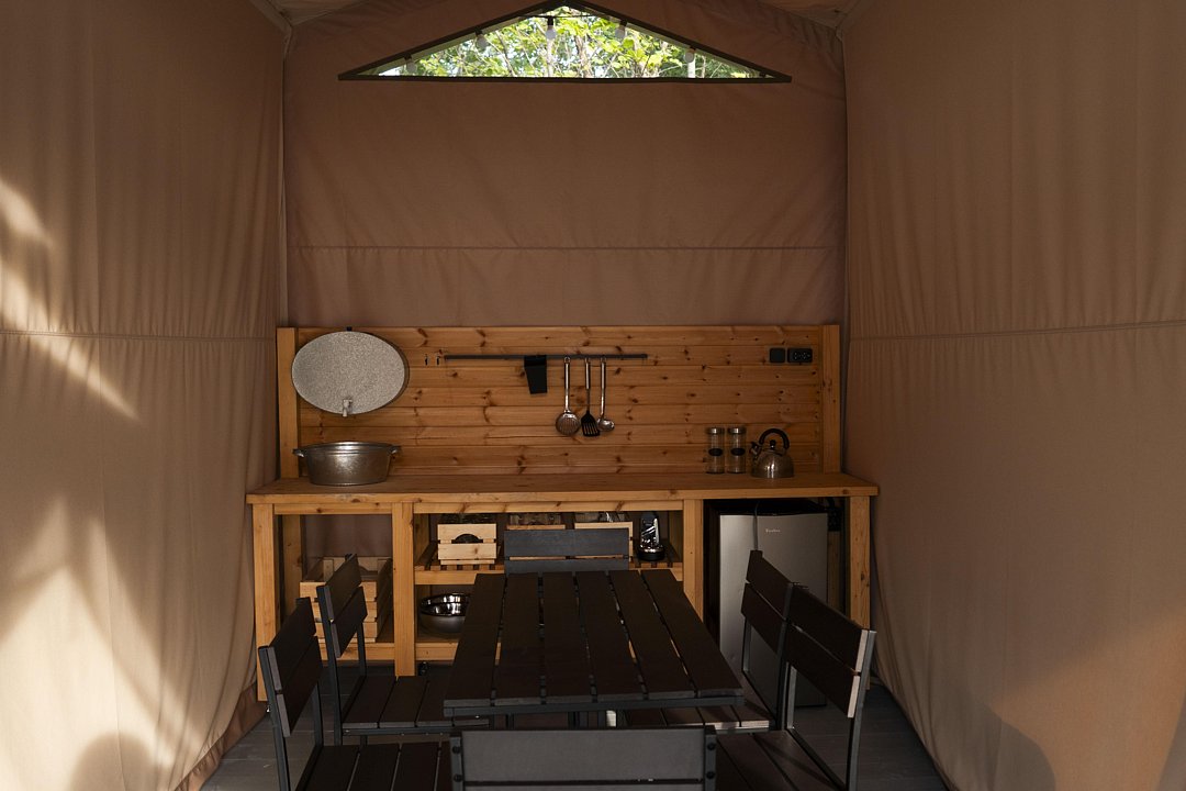 Каждый дом и сафари-тент в этом уединенном уголке природы оборудован собственным мангалом. Это позволяет гостям не только наслаждаться изысканными блюдами, приготовленными на свежем воздухе, но и самим участвовать в творческом процессе кулинарного искусства.