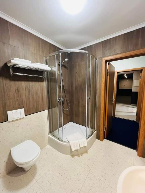 телевизор, Wi-Fi, кондиционер, светильник, фен, душевая кабина, санузел, халаты, банные полотенца, двуспальная кровать, шкаф для одежды, вешалки, журнальный столик, зеркало, пуфики, унитаз, ковровое покрытие, кулер на этаже, стул, тумба, внутренний телефон, телевизор с плоским экраном, мини-холодильник, без питомцевВ номере