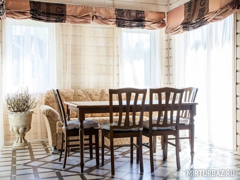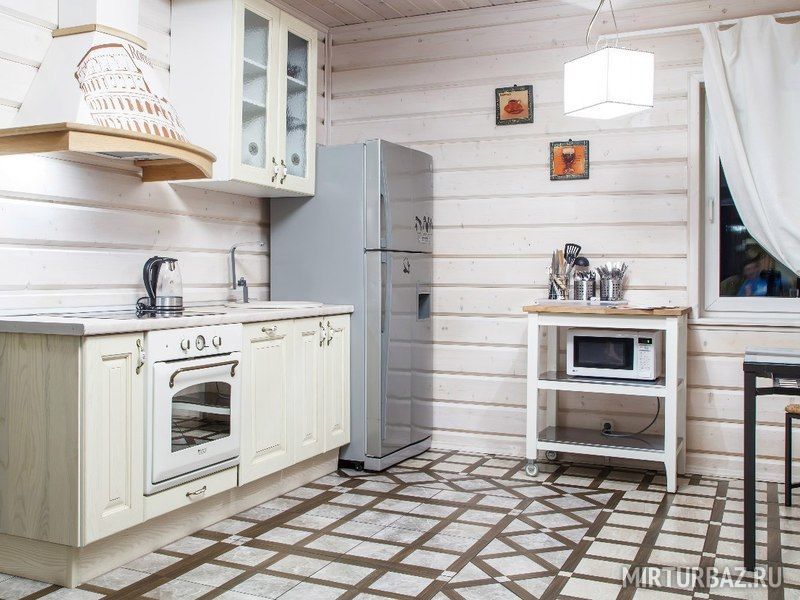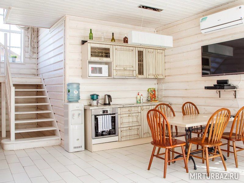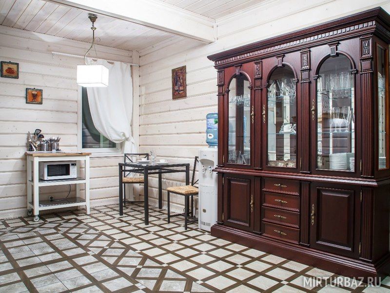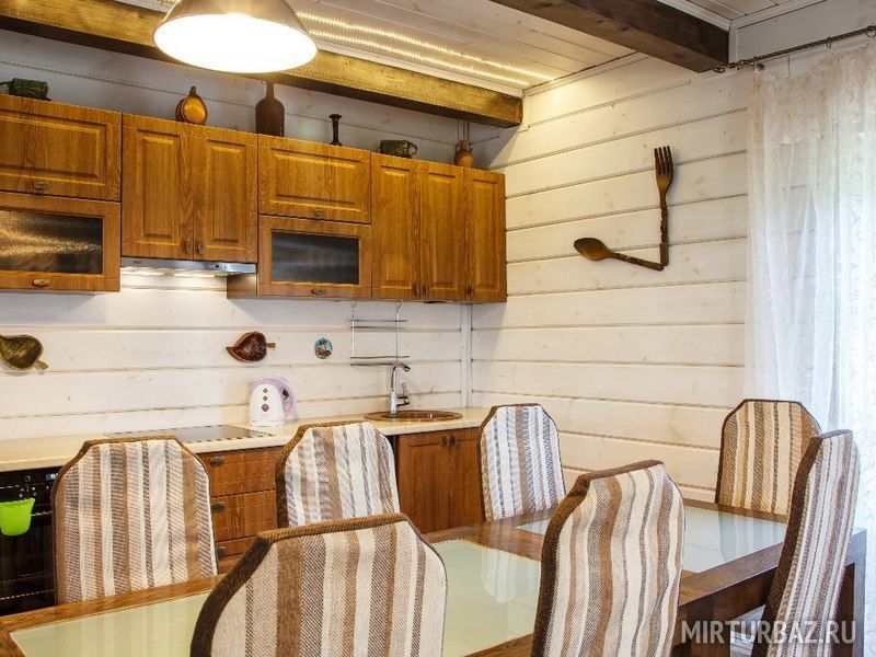 - Кухня: электроплита, электрический чайник, микроволновая печь, вытяжка, холодильник, посуда для приготовления еды, набор посуды для сервировки на 6-8 персон.