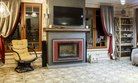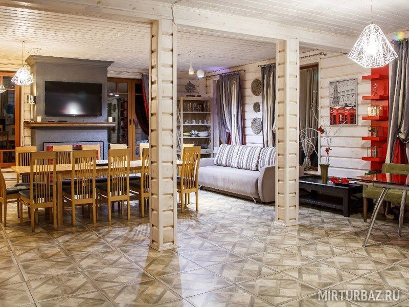 - Холл: мягкая мебель, стол на 10 персон, стулья, мягкие посадочные места на 10-15 человек, действующий камин, спутниковое телевидение.
