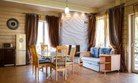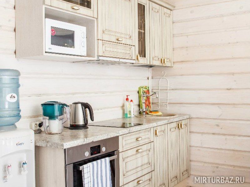 - Кухня: электроплита, встроенный духовой шкаф, электрический чайник, микроволновая печь, вытяжка, холодильник, посуда для приготовления еды, набор посуды для сервировки на 12 и более персон.