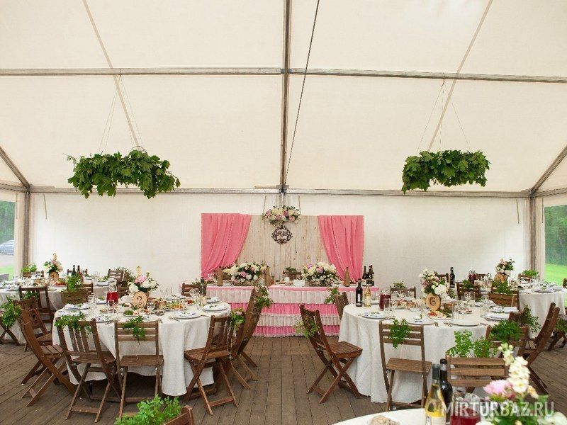 Шатер для банкета на 100 кв.м. Сезон использования с мая по октябрь. В стоимость аренды шатра входит: аренда помещения, столы, стулья, электричество. Отопление шатра осуществляется газовыми тепловыми пушками и входит в стоимость аренды.