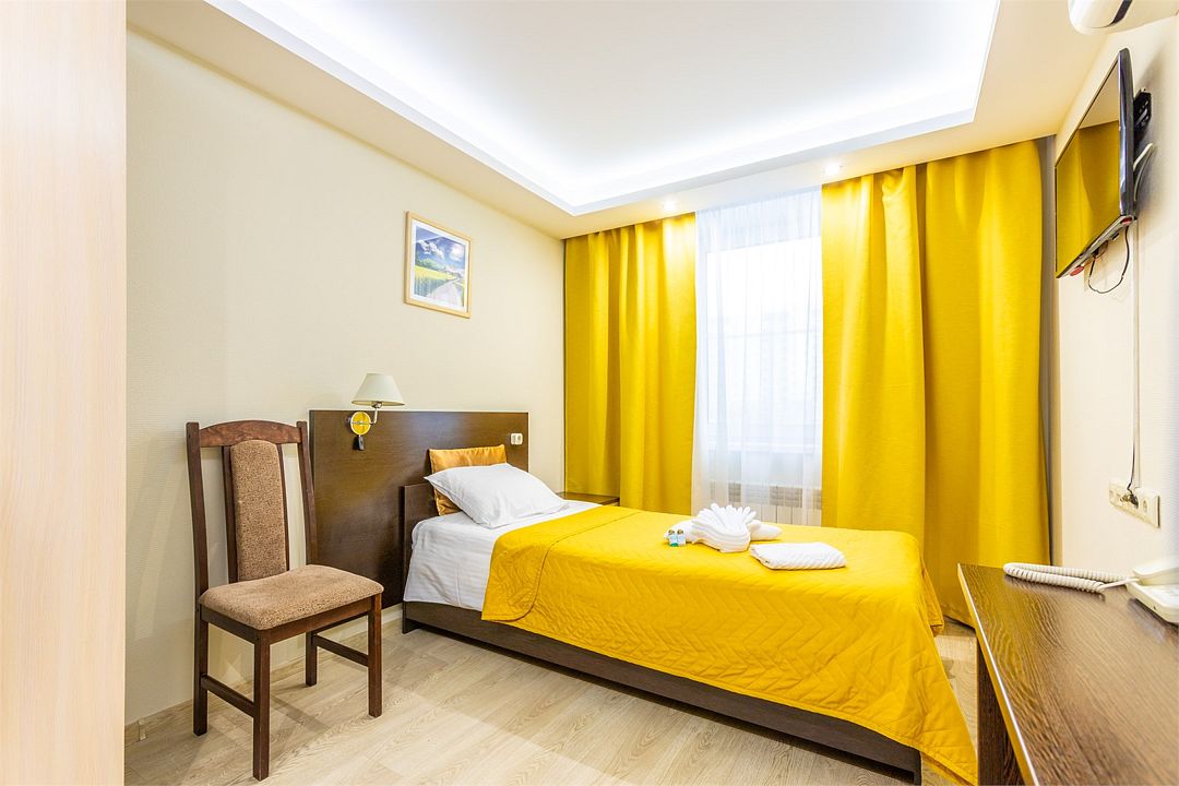 Одноместный номер класса "Стандарт" с общей ванной комнатой и общим санузлом на два номера. Удобная одноместная кровать, мягкие светлые тона и комфортное освещение помогут восстановить растраченные силы во время дальних рабочих командировок.Услуги и удобства