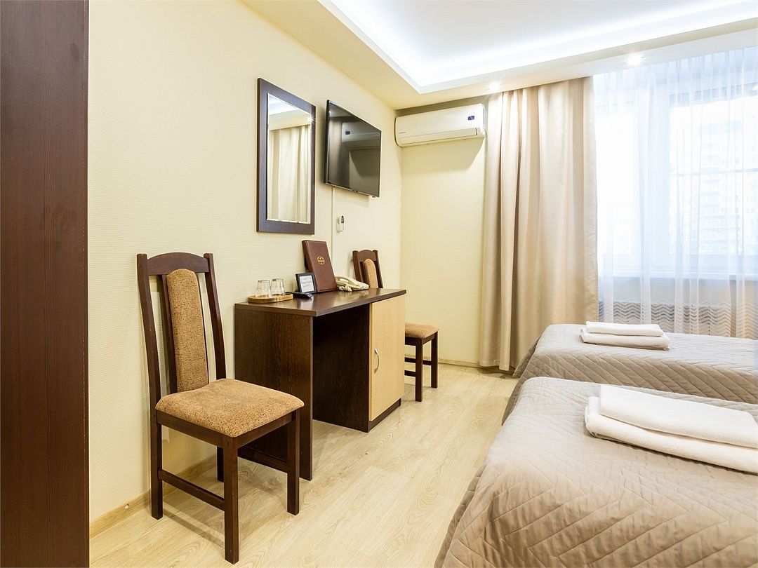 спутниковое телевидение, Wi-Fi, интернет, телефон, кондиционер, светильник, фен, система безопасности, обогреватель, ванная комната, душевая кабина, ванна или душевая кабина, санузел, банные принадлежности, банные полотенца, тапочки, косметические средства, две односпальные или большая двуспальная кровать, ортопедический матрас, шкаф для одежды, письменный стол, зеркало, мини-бар, обслуживание номеров, сейф, унитаз, раковина, душ, вид на город, кулер на этаже, вид во двор, ламинат, стаканы, стул, стол, тумба, туалетные средства, туалет, внутренний телефон, телевизор с плоским экраном, мини-холодильник, гостиничная парфюмерияВ гостиничном номере