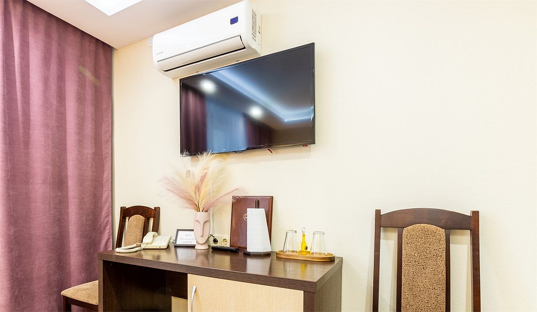 телевизор, кабельное телевидение, Wi-Fi, интернет, телефон, кондиционер, фен, система безопасности, обогреватель, душевая кабина, ванна или душевая кабина, санузел, банные принадлежности, банные полотенца, тапочки, гигиенические средства, две односпальные или большая двуспальная кровать, ортопедический матрас, шкаф для одежды, вешалки, письменный стол, зеркало, мини-бар, сейф, раковина, вид на город, кулер на этаже, вид во двор, стул, стол, тумба, туалетные средства, диван-кровать, раскладной диван, раскладное кресло, внутренний телефон, телевизор с плоским экраном, мини-холодильник, гостиничная парфюмерияВ гостиничном номере
