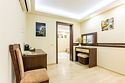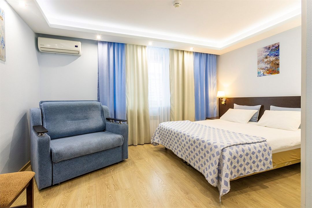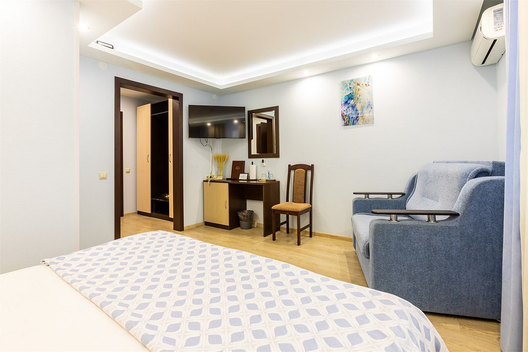 Удачное предложение для семейных пар с детьми. Просторная кровать и небольшой мягкий диван позволят удобно расположиться всей семье. Компактный письменный стол поможет организовать зону для любимых детских занятий.Услуги и удобства