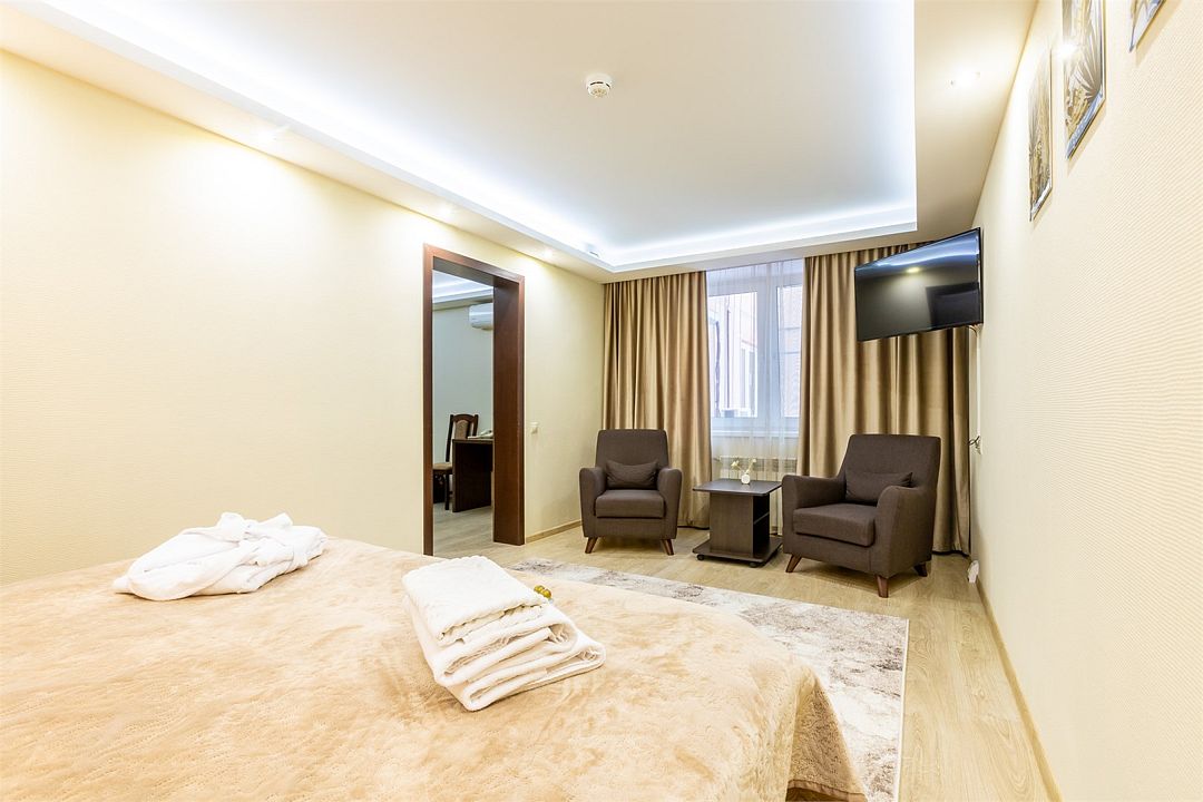 телевизор, спутниковое телевидение, Wi-Fi, интернет, телефон, кондиционер, фен, система безопасности, обогреватель, ванная комната, душевая кабина, ванна, ванна или душевая кабина, гидромассажный душ, санузел, водонагреватель, банные принадлежности, халаты, банные полотенца, тапочки, гигиенические средства, косметические средства, кровать «King size», кресла, тумбы, стулья, шкаф для одежды, гардеробная, вешалки, журнальный столик, письменный стол, стол для переговоров, зеркало, ковер, две комнаты, мини-бар, обслуживание номеров, сейф, унитаз, раковина, мягкая мебель, отопление, душ, вид на город, кулер на этаже, вид во двор, ламинат, стаканы, стол, туалетный столик, туалетные средства, туалет, внутренний телефон, телевизор с плоским экраном, мини-холодильник, гостиничная парфюмерияВ гостиничном номере