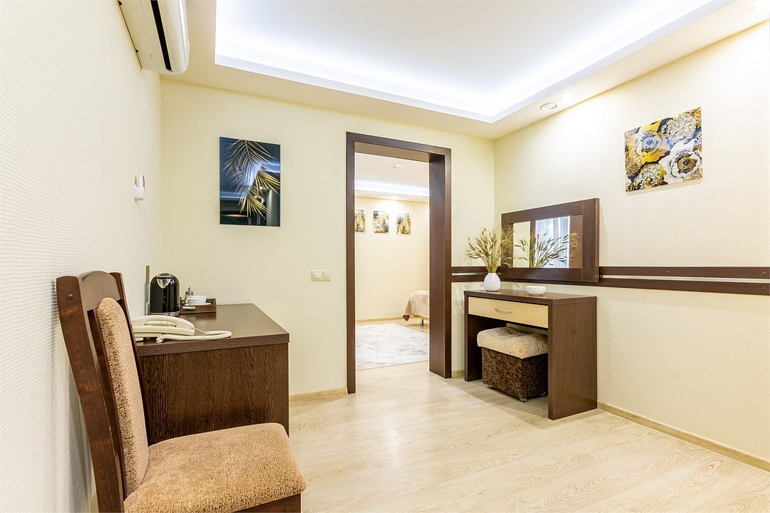 телевизор, спутниковое телевидение, Wi-Fi, интернет, телефон, кондиционер, фен, система безопасности, обогреватель, ванная комната, душевая кабина, ванна, ванна или душевая кабина, гидромассажный душ, санузел, водонагреватель, банные принадлежности, халаты, банные полотенца, тапочки, гигиенические средства, косметические средства, кровать «King size», кресла, тумбы, стулья, шкаф для одежды, гардеробная, вешалки, журнальный столик, письменный стол, стол для переговоров, зеркало, ковер, две комнаты, мини-бар, обслуживание номеров, сейф, унитаз, раковина, мягкая мебель, отопление, душ, вид на город, кулер на этаже, вид во двор, ламинат, стаканы, стол, туалетный столик, туалетные средства, туалет, внутренний телефон, телевизор с плоским экраном, мини-холодильник, гостиничная парфюмерияВ номере