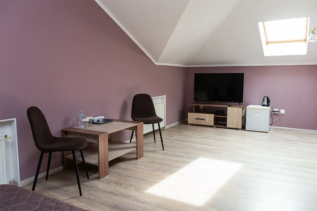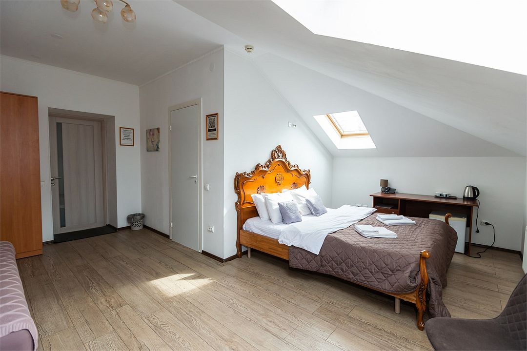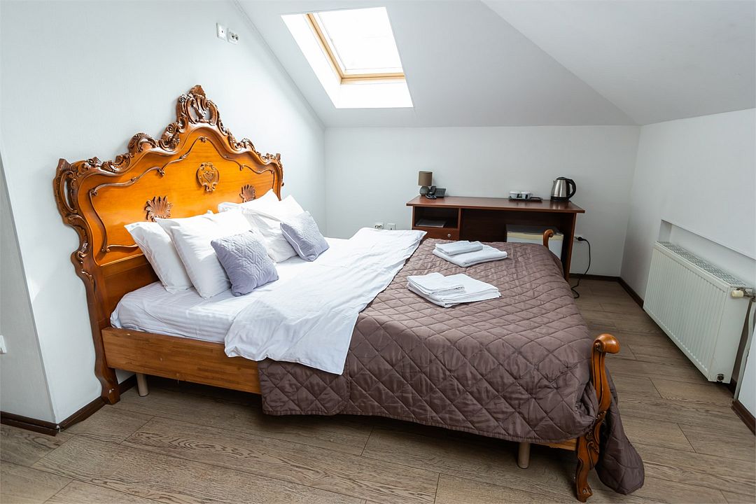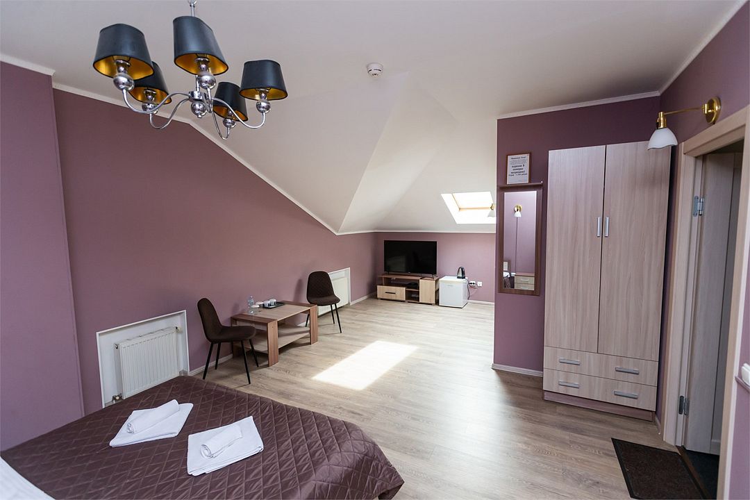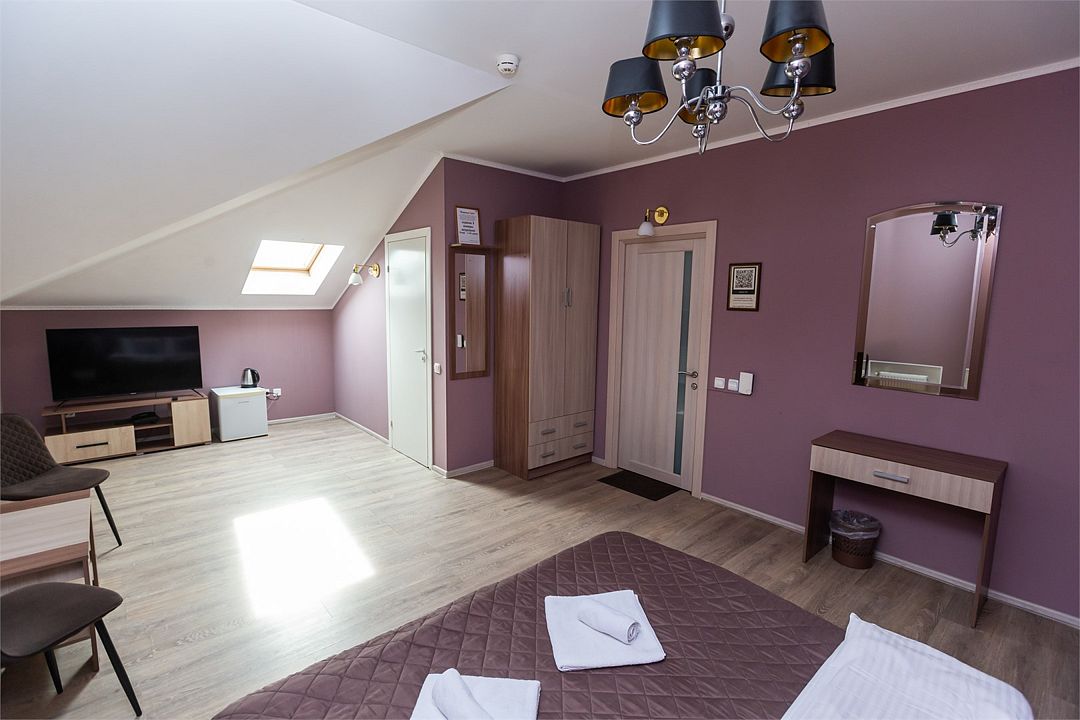 телевизор, Wi-Fi, фен, ванная комната, душевая кабина, ванна, банные принадлежности, халаты, банные полотенца, тапочки, косметические средства, кровать «King size», двуспальная кровать, тумбы, стулья, шкаф для одежды, журнальный столик, зеркало, комод, чайный набор, обслуживание номеров, чайник, раковина, отопление, душ, кулер на этаже, вид во двор, стаканы, стол, туалетный столик, туалет, внутренний телефон, мини-холодильник, мансардные окна, телевизор со Smart TV, номер для некурящих, чайная станция, уборка номера, набор для приготовления чая и кофе, бутилированная вода, мыло, можно с питомцамиВ гостиничном номере
