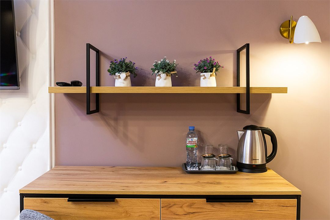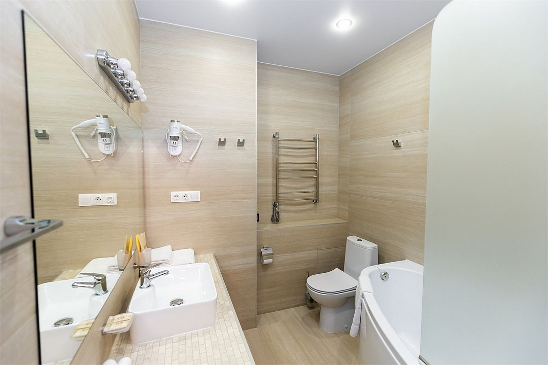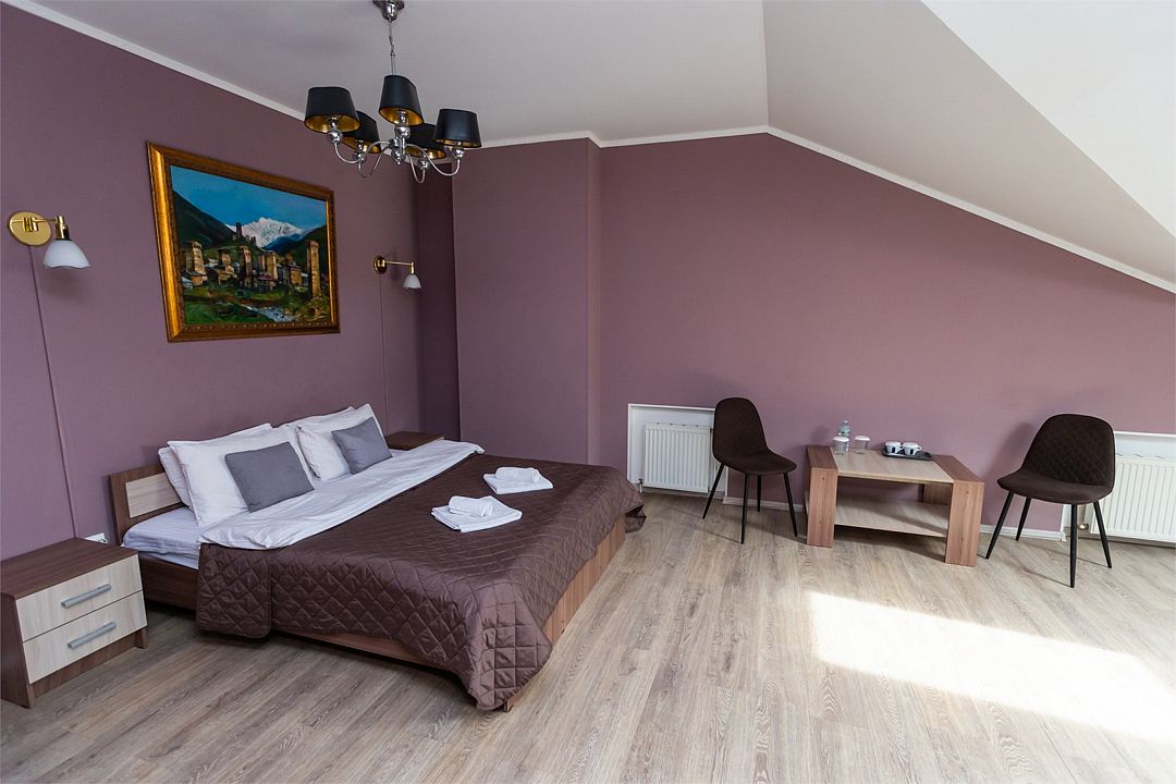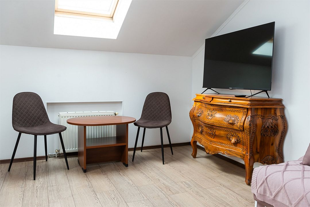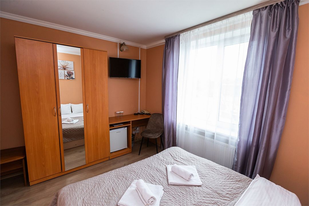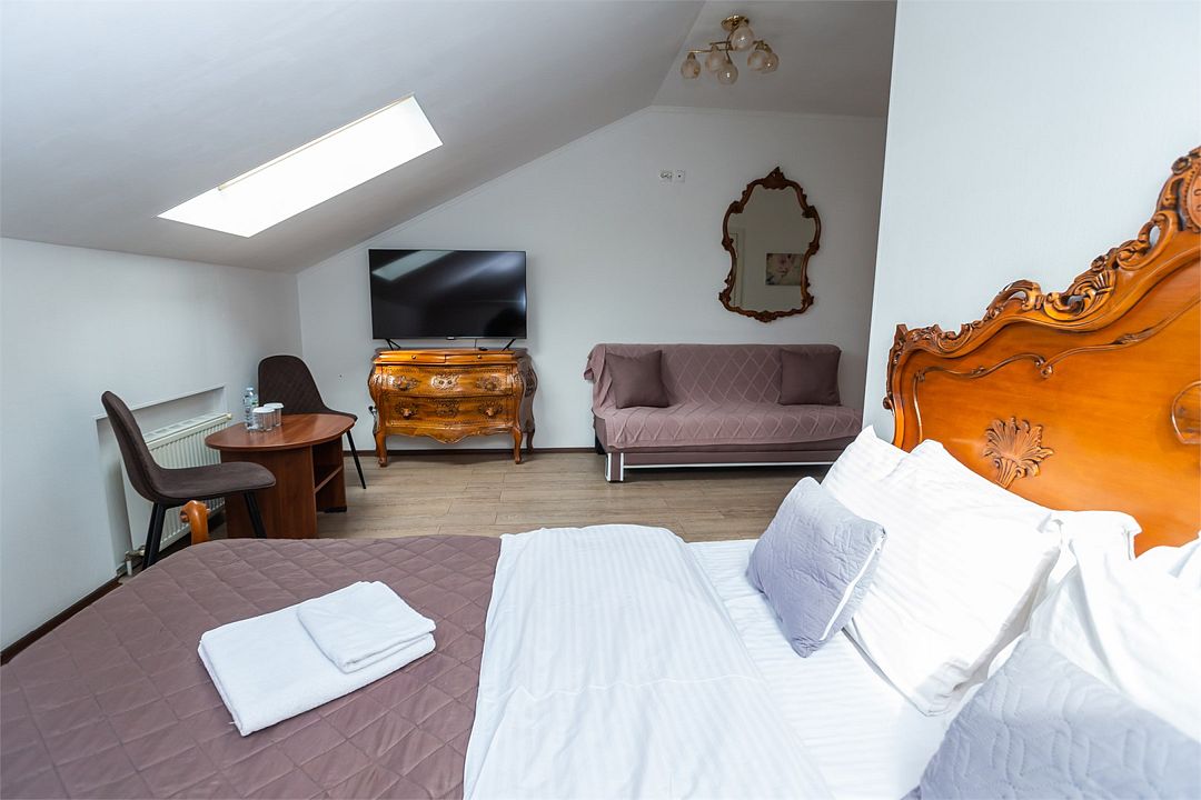 телевизор, Wi-Fi, фен, ванная комната, душевая кабина, ванна, банные принадлежности, халаты, банные полотенца, тапочки, косметические средства, кровать «King size», двуспальная кровать, тумбы, стулья, шкаф для одежды, журнальный столик, зеркало, комод, чайный набор, обслуживание номеров, чайник, раковина, отопление, душ, кулер на этаже, вид во двор, стаканы, стол, туалетный столик, туалет, внутренний телефон, мини-холодильник, мансардные окна, телевизор со Smart TV, номер для некурящих, чайная станция, уборка номера, набор для приготовления чая и кофе, бутилированная вода, мыло, можно с питомцамиВ гостиничном номере
