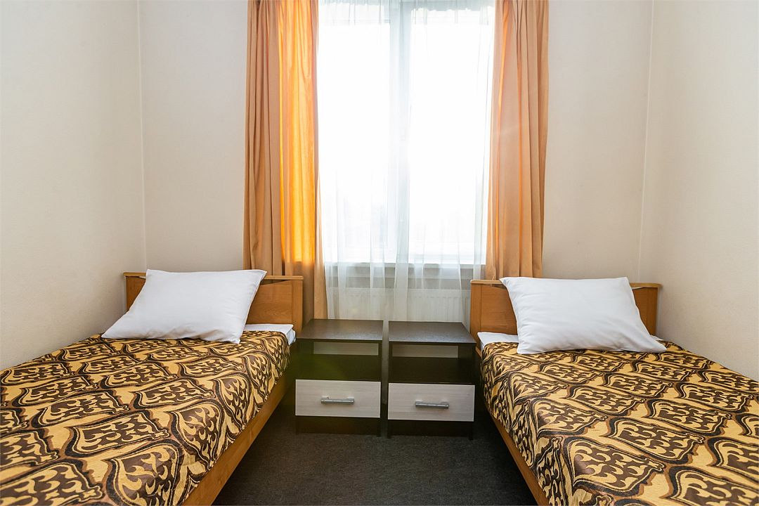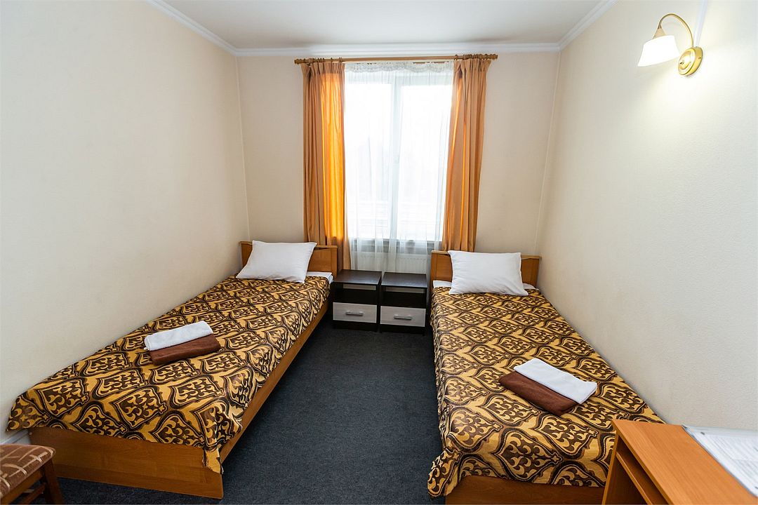 Категория номеров «Стандарт », оснащена всем необходимым для комфортного проживания. На каждом этаже гостевого комплекса имеется кулер с горячей водой. Площадь номеров категории «Стандарт» составляет 12 кв. м. Комнаты меблированы кроватями с удобными матрацами, обеспечивающими полноценный здоровый сон. Номера надежно защищены от шума снаружи и сквозняков за счет современных стеклопакетов. Интерьер выполнен в спокойных пастельных тонах, способствующих уютному отдыху и расслаблению. Все номера оборудованы ванными комнатами с душем.Услуги и удобства