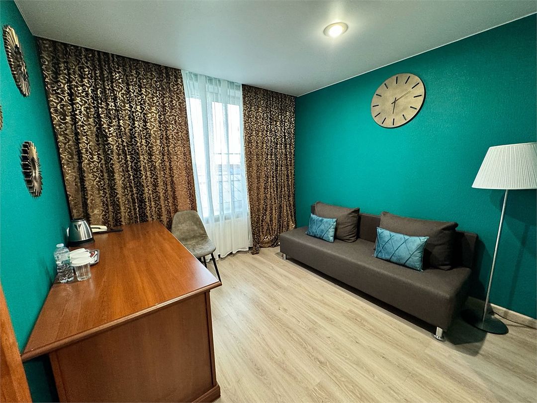 Простор и наличие улучшенной планировки в виде спальной зоны с большой двуспальной кроватью и гостевой зоны с раскладным диваном. Этот номер станет прекрасным выбором для путешествия с семьей. Площадь номера составляет в среднем 32 кв. м. В ванной комнате установлена душевая кабина, имеются туалетные принадлежности, халаты, тапочки, комплект полотенец,чайная станция.Услуги и удобства