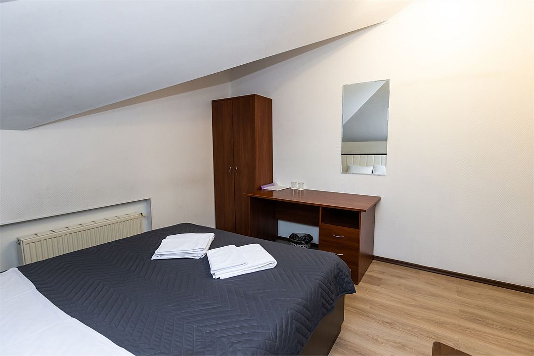 телевизор, кабельное телевидение, Wi-Fi, интернет, санузел, банные полотенца, гигиенические средства, кровать «King size», двуспальная кровать, тумбы, шкаф для одежды, вешалки, зеркало, мебельный гарнитур, отопление, душ, кулер на этаже, вид во двор, стаканы, туалет, внутренний телефон, мансардные окна, номер для некурящих, рабочий стол, уборка номера, можно с питомцамиВ гостиничном номере