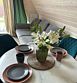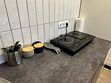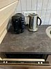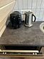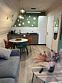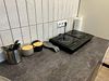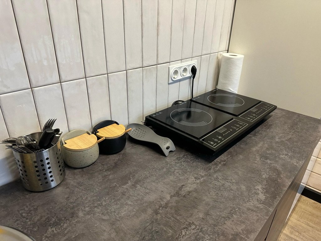 Кухонная зона: кухонный гарнитур, обеденная зона, холодильник, плита, микроволновая печь, электрический чайник, посудомоечная машина, кофемашина, посуда, базовая бакалея.