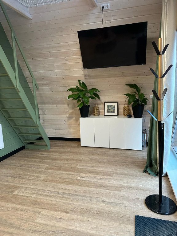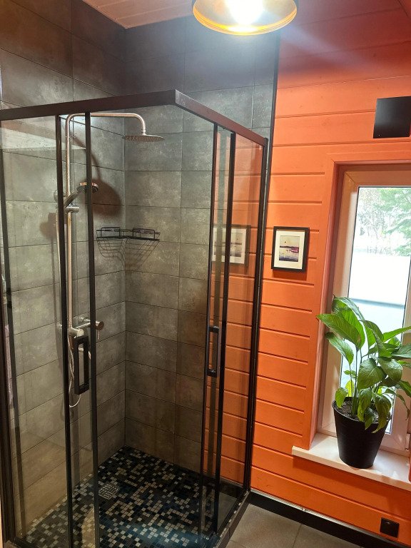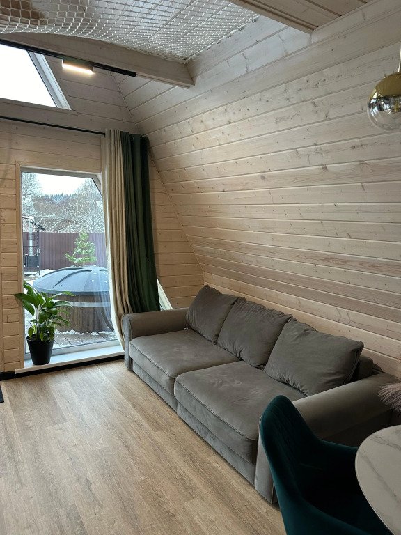 Внутреннее оснащение: система тёплого пола, голосовой помощник, панорамные окна, терраса с мебелью, телевизор с доступом в интернет, Wi-Fi, утюг. На территории: японская баня фурако, зона барбекю, костровая зона, парковка.