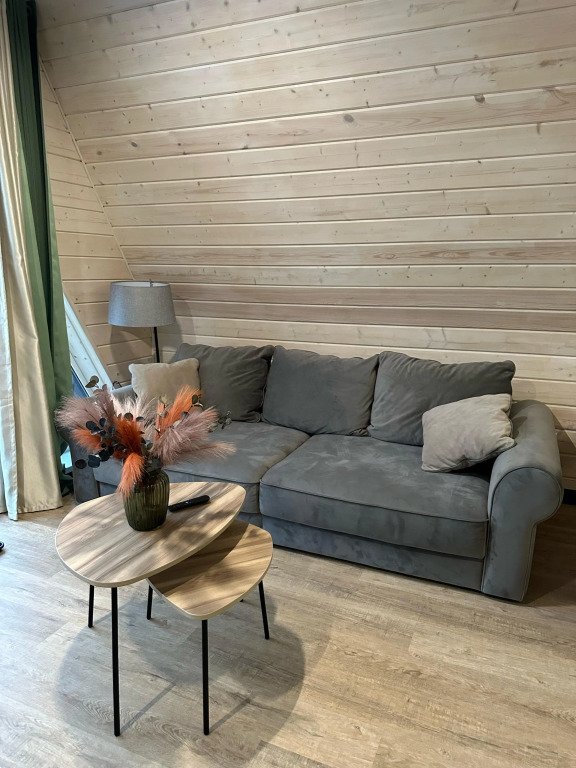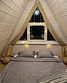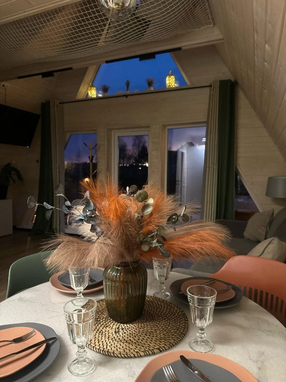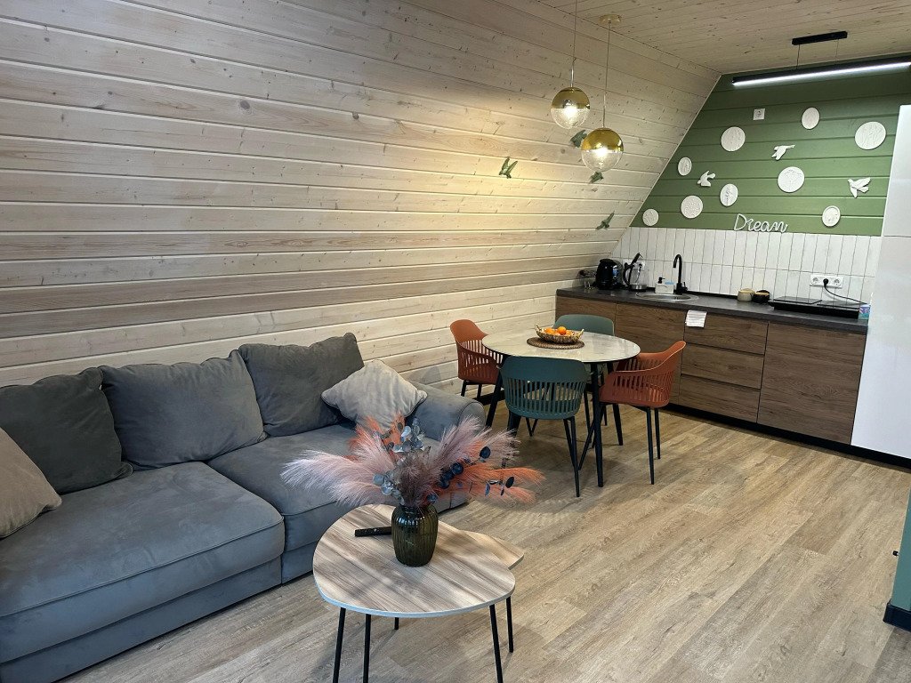 Дом выполнен в архитектурном стиле A-frame. Вместимость — до четырёх взрослых гостей. Возможно размещение одного ребёнка на дополнительном спальном месте. Спальные места: кровать с двуспальным ортопедическим матрасом Askona на втором этаже и раскладной диван на первом этаже.