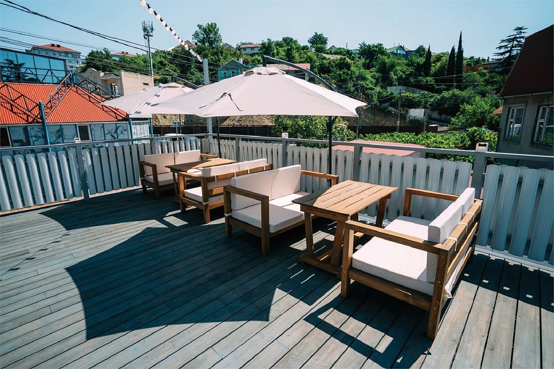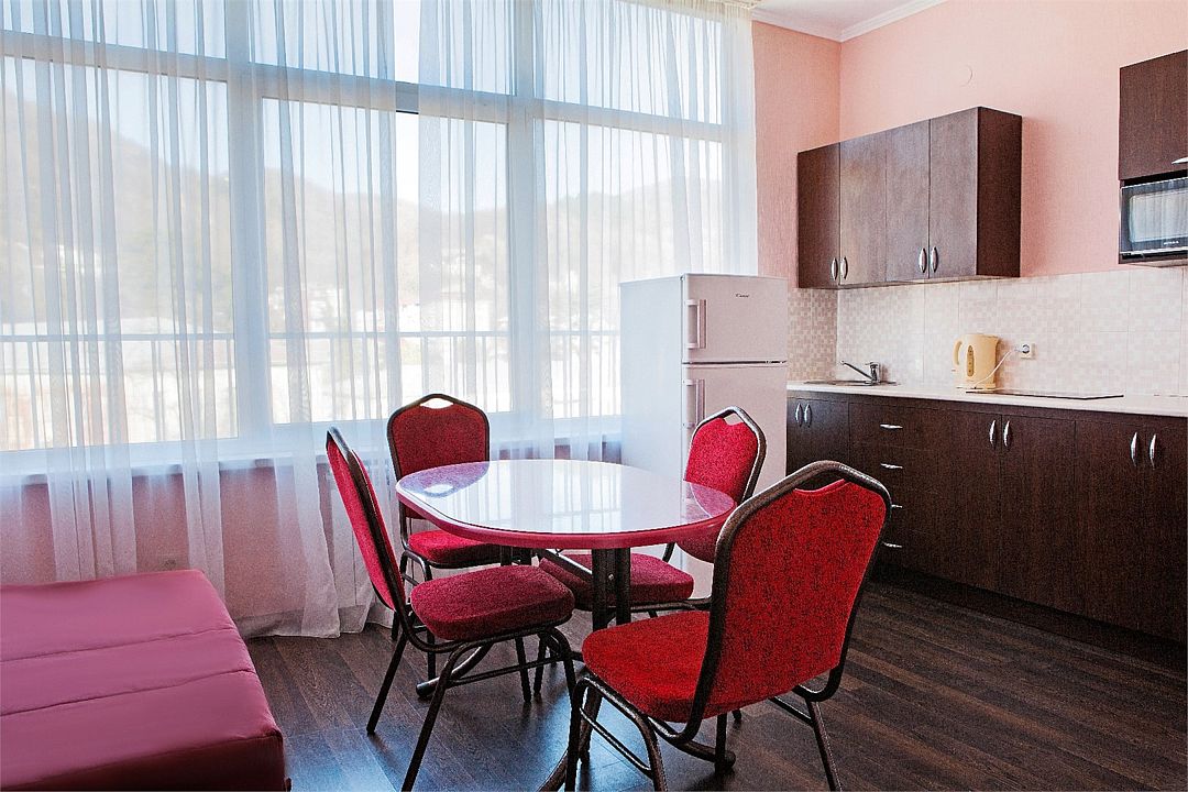 Трехэтажное здание гостевого дома находится в зеленом районе Туапсе среди малоэтажной застройки. Он вмещает 55 гостей и предлагает как двухместные стандартные номера, так и 4-местные семейные. Постояльцы могут выбрать проживание без питания или включить завтраки либо двухразовое питание (завтрак + ужин) в стоимость.