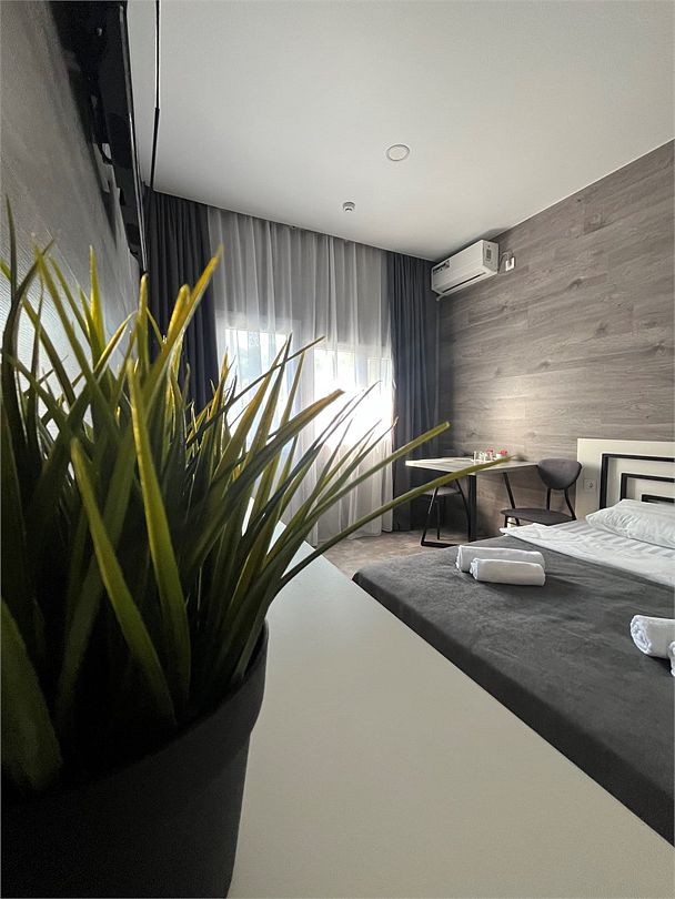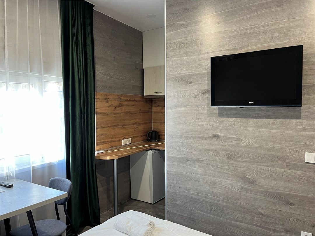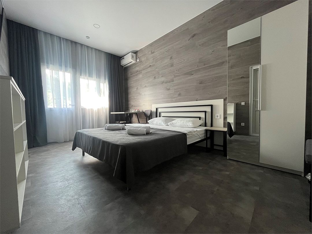 Комфортный и стильный двухместный номер с мини-кухней. Расположен в 30-ти метрах от основного корпуса. В стоимость проживания входит посещение горечей русской баней и открытого подогреваемого бассейна.Услуги и удобства