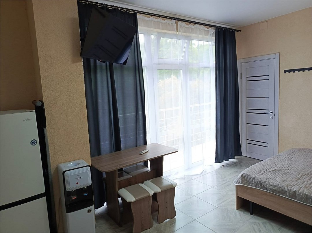 Просторный номер-студия с панорамным видом, оснащен всем необходимым для комфортного проживания, кухонная зона, собственный санузел, сплит-система, андроид-ТВУслуги и удобства