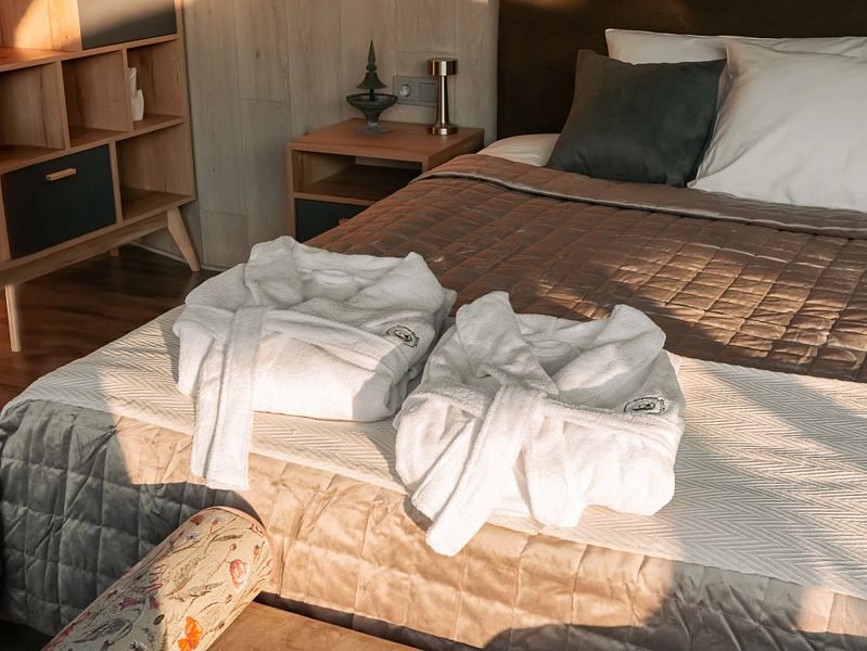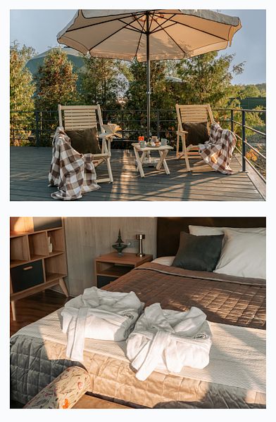 Кровать king size 180/200, мини бар, кондиционер, собственная терраса и выход к реке, панорамные окна и дополнительные спальные места.
