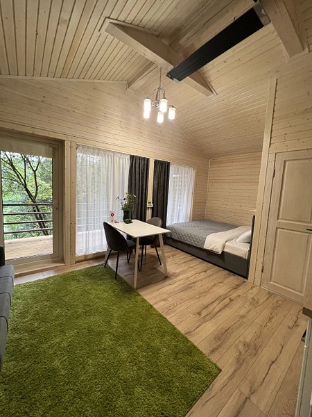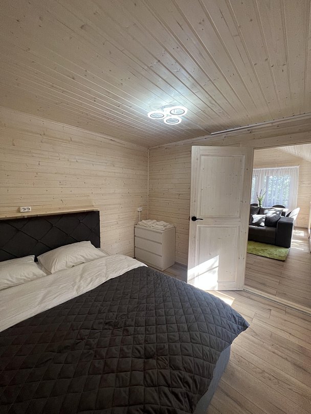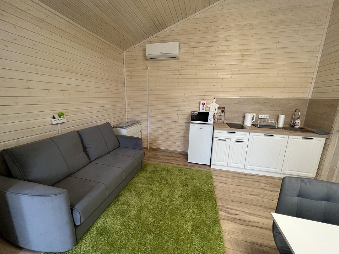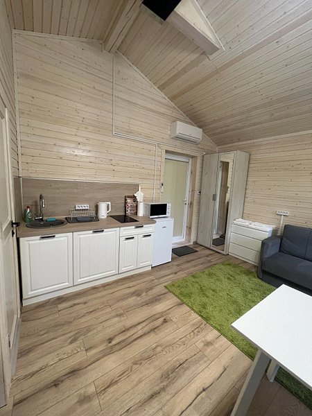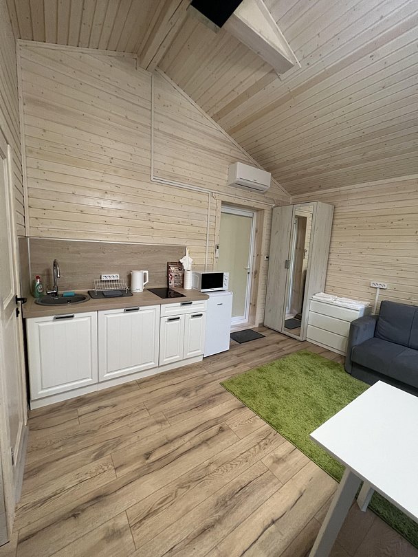 Одна большая комната с двуспальной кроватью и раскладным диваном. Душ, туалет. Возможно размещение до 4 человек.