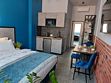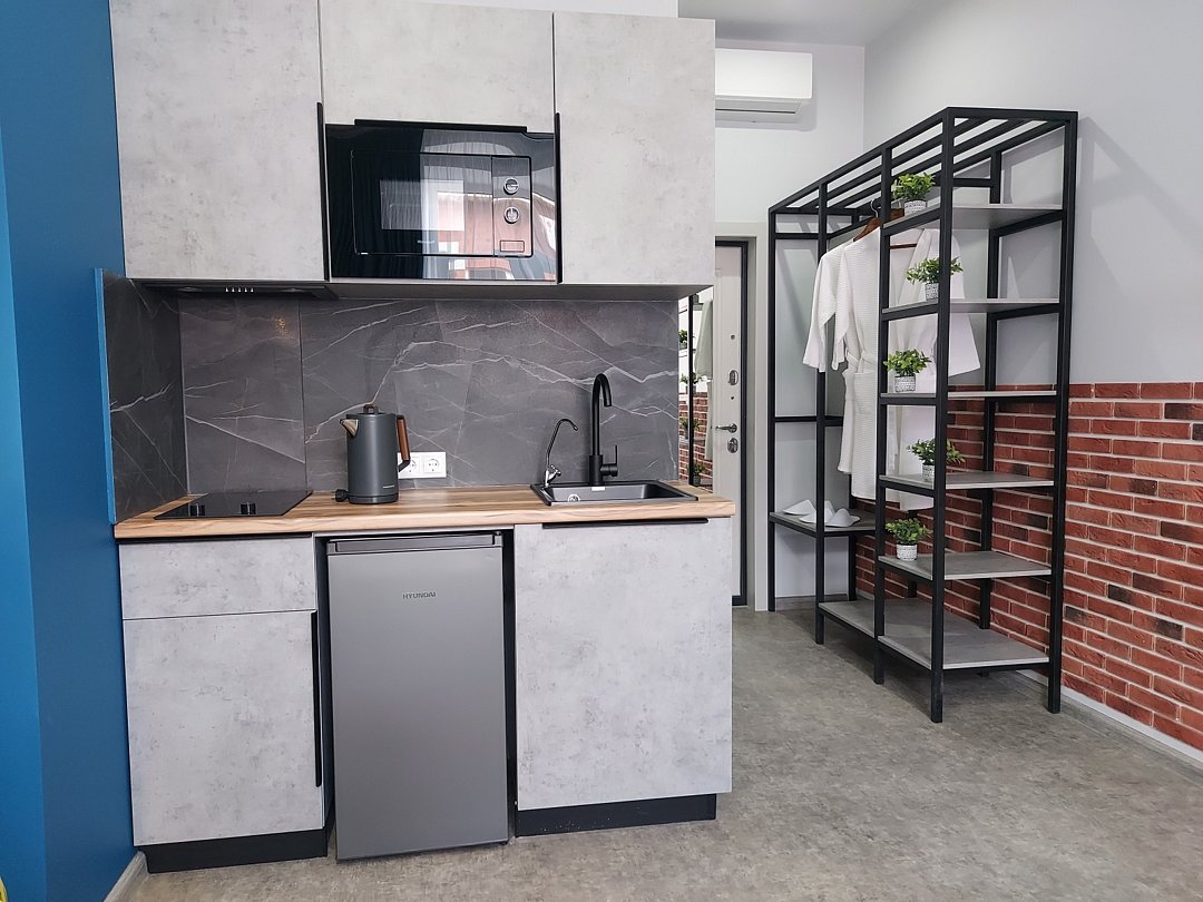 В каждом номере оборудованная кухня, чай, питьевая вода, чайник, холодильник, микроволновка, варочная плита, посуда, телевизор, кондиционер, отопление, гостиничное белье и полотенца, душевые принадлежности, тапочки, халаты (платно)