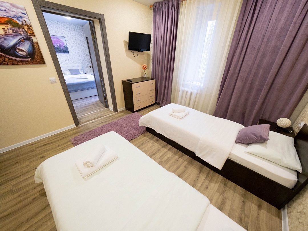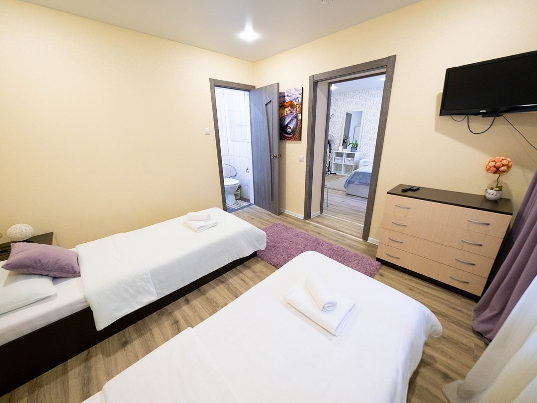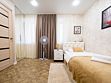 Мы рады предложить Вам размещение в одном из наших номеров, категории «Семейный», который разделён на две спальные зоны. Данный номер – лучший выбор для семьи, которая предпочитает путешествовать и оставаться вместе. Номер для размещения от одного до четырёх человек. Просторный и уютный номер в тёплых тонах, идеально сочетает в себе стиль и комфорт. Номер оснащён всем необходимым для проживания гостей. В одной комнате расположилась двуспальная кровать, прикроватные тумбочки, комод, телевизор. Дополняет обстановку мини-кухня: обеденный стол на 4 персоны, электрический чайник, микроволновая печь, холодильник. Во второй комнате расположились две раздельные односпальные кровати, прикроватные тумбочки, комод, телевизор. В каждой комнате есть ванные комнаты с душевой, туалетом и раковиной. Гигиенические принадлежности: мыло, шампунь, гель. Фен, комплект полотенец, тапочки.В номере