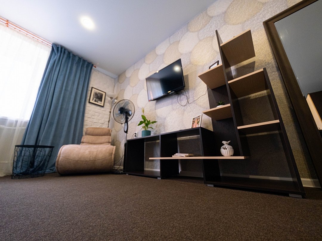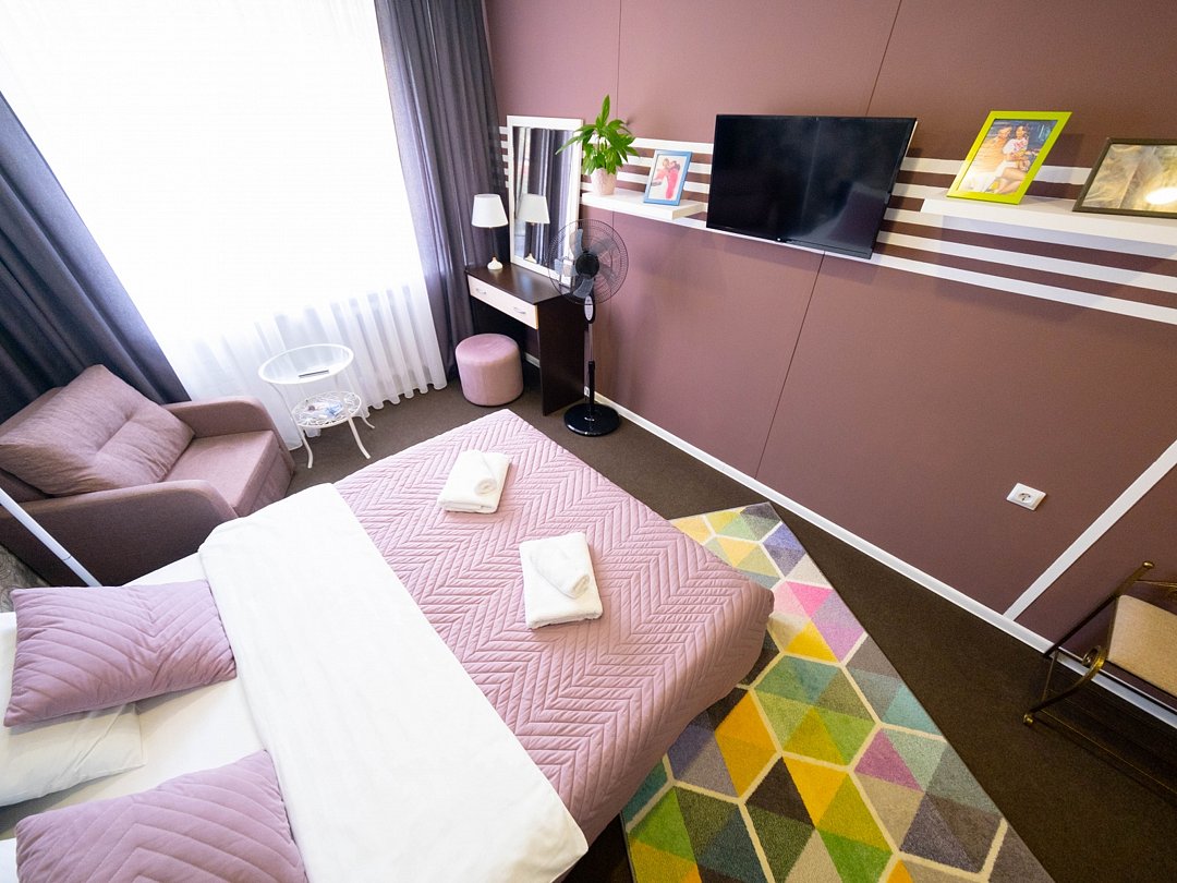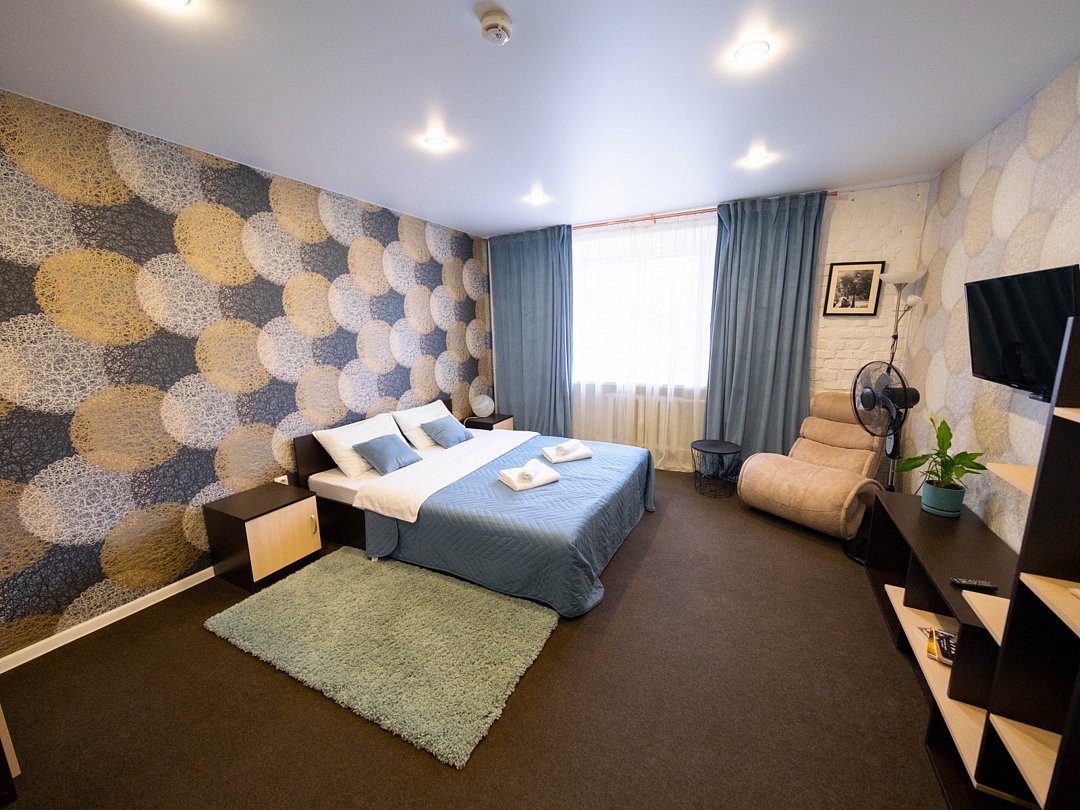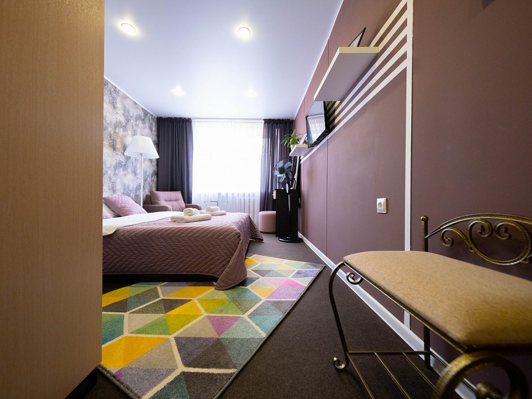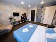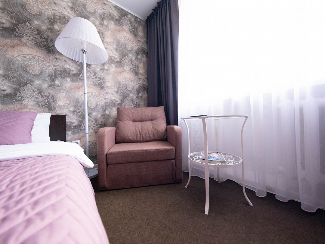 Современный комфортабельный номер, простой, но максимально стильный интерьер и продуманные детали: шторы, декор, освещение. Идеален для размещения двух человек. Мягкая двуспальная кровать, тумбочки, шкаф, журнальный столик, возле которого можно расположиться в удобном кресле и посмотреть телевизор. В ванной комнате: душевая, раковина, туалет, а так же гигиенические принадлежности: мыло, шампунь, гель для душа, фен, комплект полотенец, тапочки. На территории всего отеля работает бесплатная WiFi сеть. Забронировать номерВ номере