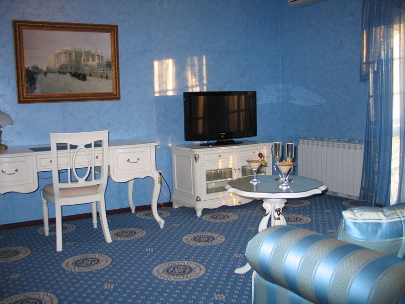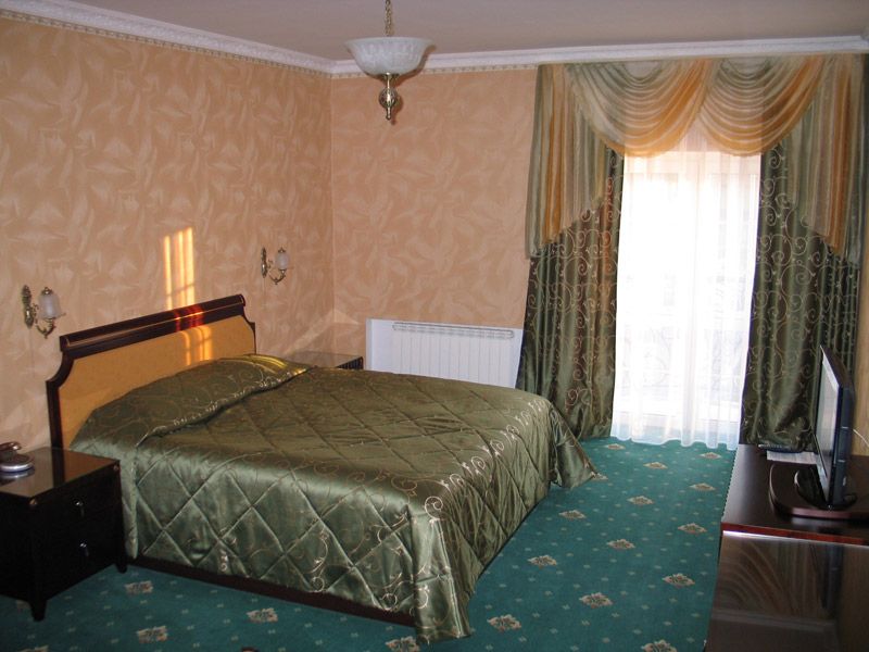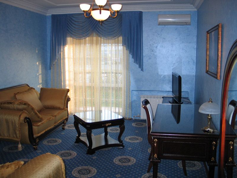 В номере: итальянская мебель, бельгийское ковровое покрытие, одна большая двуспальная кровать, софа, обволакивающие кресла, балкон, сейф, кондиционер, 2 ж/к телевизора с большой диагональю, DVD-проигрыватель, мини-бар, телефон, Wi-Fi, охранная и противопожарная сигнализация, приятный презент от администрации Гостевого Дома.