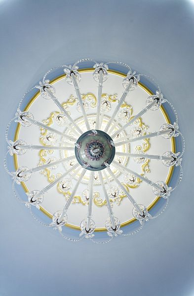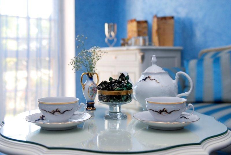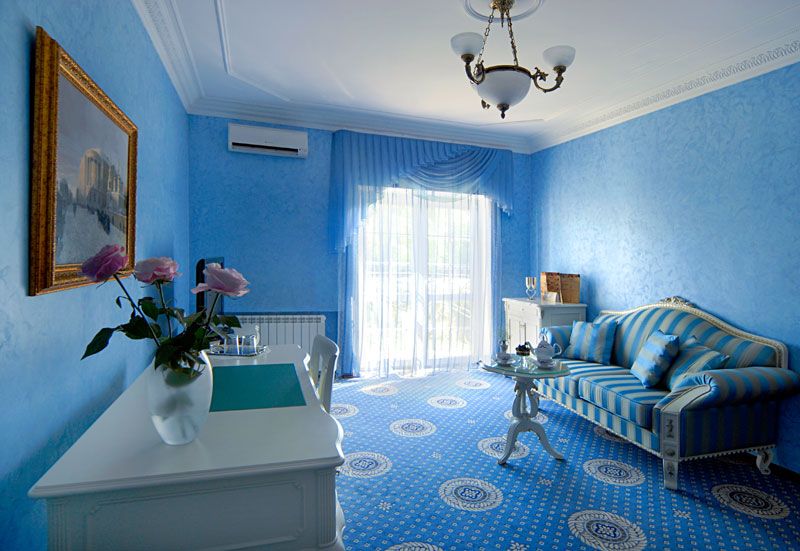 Банкетный зал ресторана выполнен в нежных оттенках голубого и синего, дополняемых белыми и блекло-золотыми акцентами. В этом уютном пространстве, вмещающем до 40 гостей, начинается день с вкусных и сытных завтраков.
