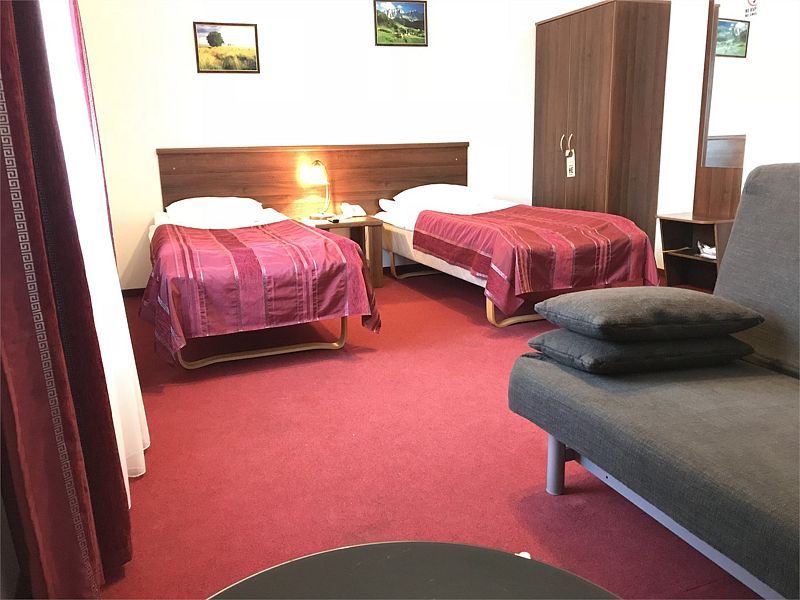 В этом уютном семейном номере площадью 20 м² расположены две раздельные кровати и диван-трансформер, на которых комфортно может разместиться семейная пара и до двух взрослых детей. Всего номер готов принять до четырех взрослых гостей.