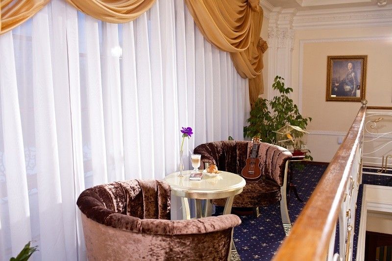 В живописном дворике отеля установлен памятник царю Александру II, а на втором этаже находится портретная галерея Романовых, которая погружает гостей в атмосферу величия и истории.