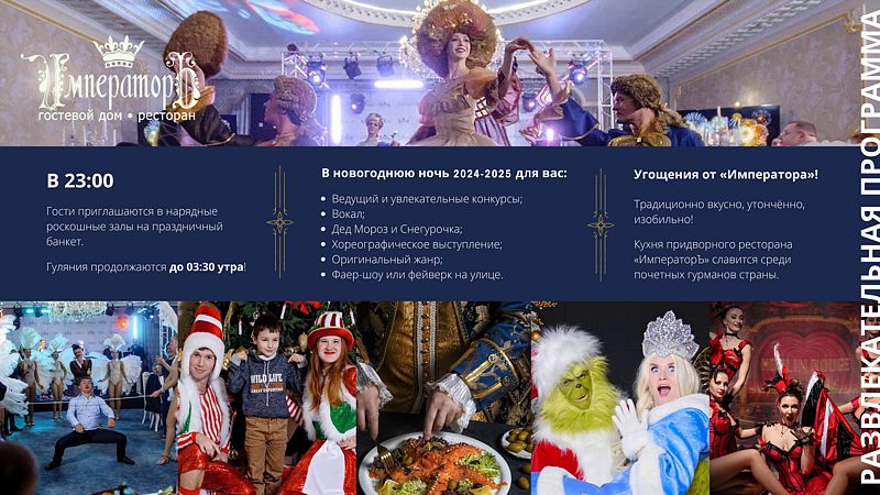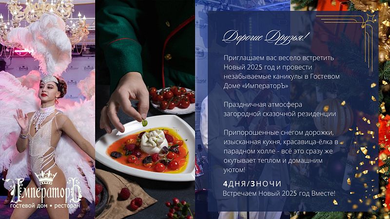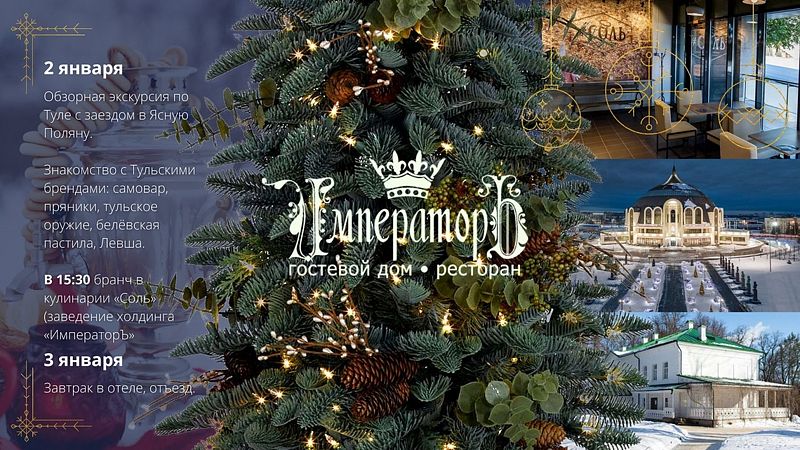 Гостевой дом «Императоръ» приглашает вас ярко встретить Новый 2025 год и провести его первые дни в увлекательной обстановке. Программа наполнена интересными событиями, включая барбекю-пикник, полезные мастер-классы и авторскую экскурсию по городу с посещением Ясной Поляны — и это лишь начало!