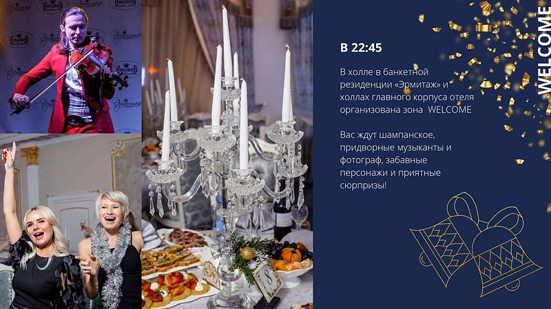 Проведите незабываемый новогодний корпоратив в одном из трех стильных залов: просторном «Эрмитаже», банкетном зале «Бордовом» или уютном зале «Лазурном». Вас ждет изобилие закусок как холодных, так и горячих, интерактивные развлечения от профессиональных шоуменов и уникальные фотосессии в роскошных интерьерах и живописном дворике.