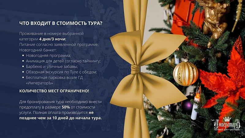 Читать полностьюГостевой дом «Императоръ» приглашает вас ярко встретить Новый 2025 год и провести его первые дни в увлекательной обстановке. Программа наполнена интересными событиями, включая барбекю-пикник, полезные мастер-классы и авторскую экскурсию по городу с посещением Ясной Поляны — и это лишь начало!