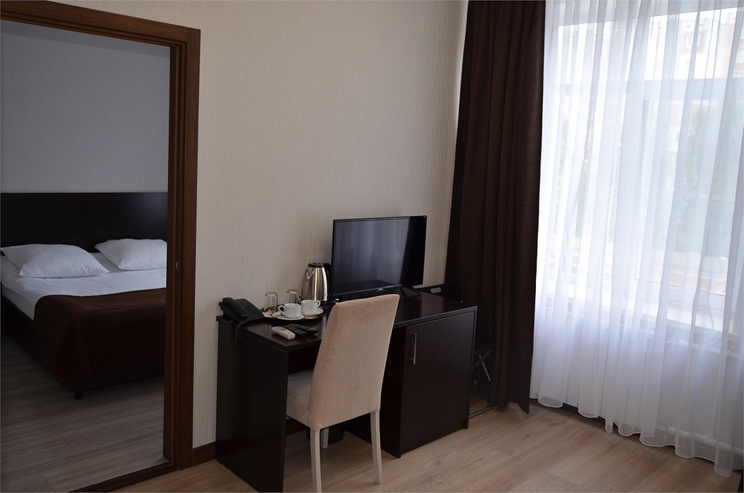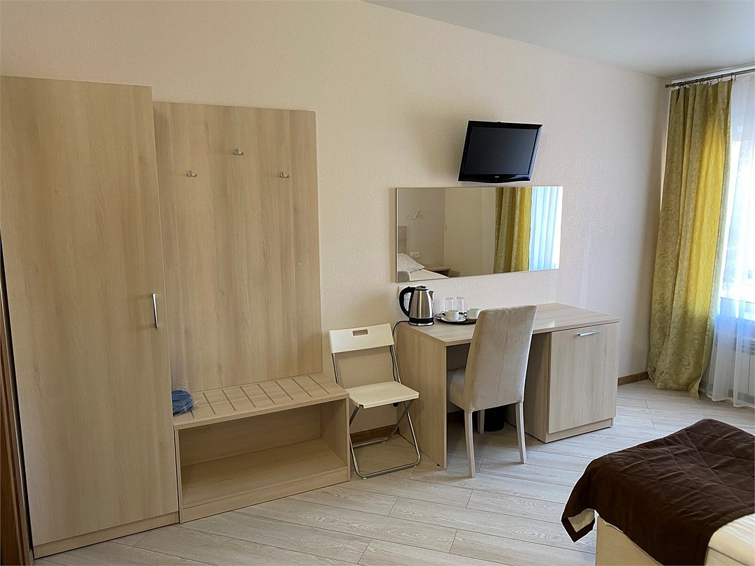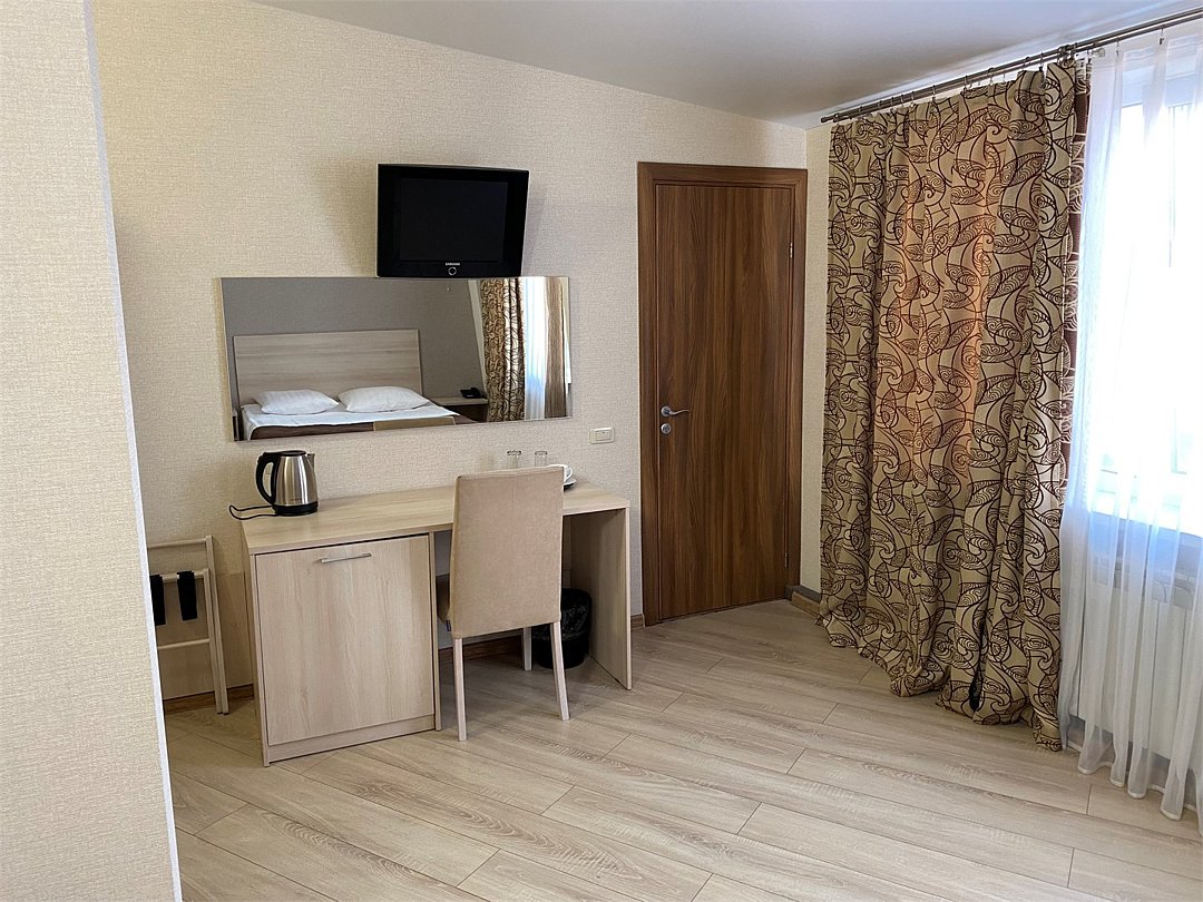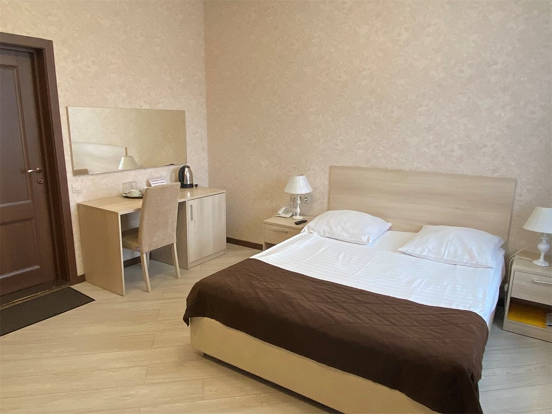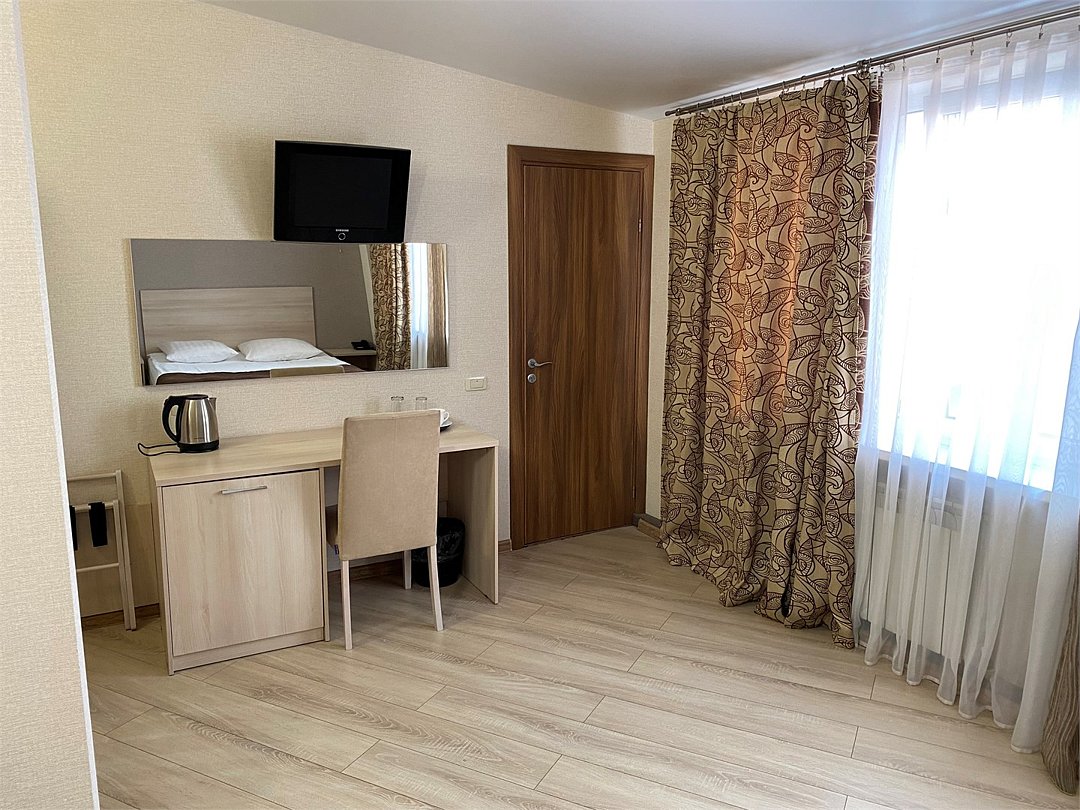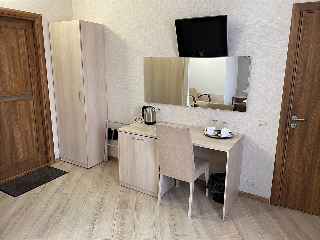 телевизор, Wi-Fi, телефон, кондиционер, настольные лампы, фен, ванная комната, душевая кабина, банные полотенца, тапочки, двуспальная кровать, диван, тумбы, шкаф для одежды, журнальный столик, письменный стол, зеркало, чайный набор, чайник, унитаз, раковина, ковровое покрытие, отопление, вид во двор, высокие потолки, стул, туалетные средства, цифровое тв, внутренний телефон, мини-холодильник, москитная сеткаВ номере